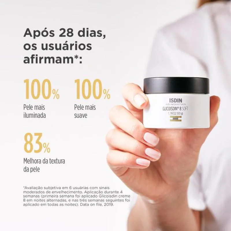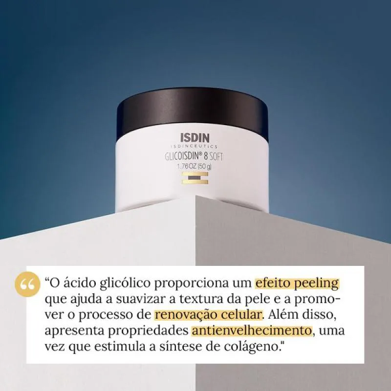 Creme Facial com Efeito Peeling ISDIN Isdinceutics Glicoisdin 8 Soft combina a capacidade esfoliante e renovadora do ácido glicólico com o poder hidratante do óleo de borragem, para reduzir rugas, linhas finas e hiperpigmentações, além de melhorar a textura, elasticidade, hidratação e luminosidade da pele.