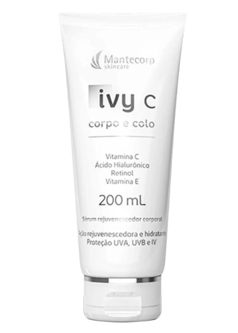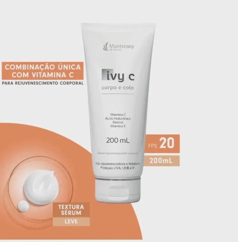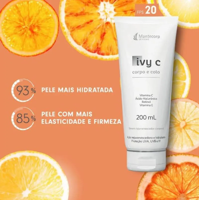 É um sérum anti-idade. IVY C Corpo e Colo é a base de vitamina c, que atua como antioxidante e rejuvenescedor. Possui em sua fórmula Ácido Hialurônico, Retinol e Vitamina E, que, juntos, auxiliam na produção de colágeno, renovação celular e ação antioxidante. Conta, ainda, com os ativos altamente hidratantes, como a Glicerina e Óleo de Semente de Uva.