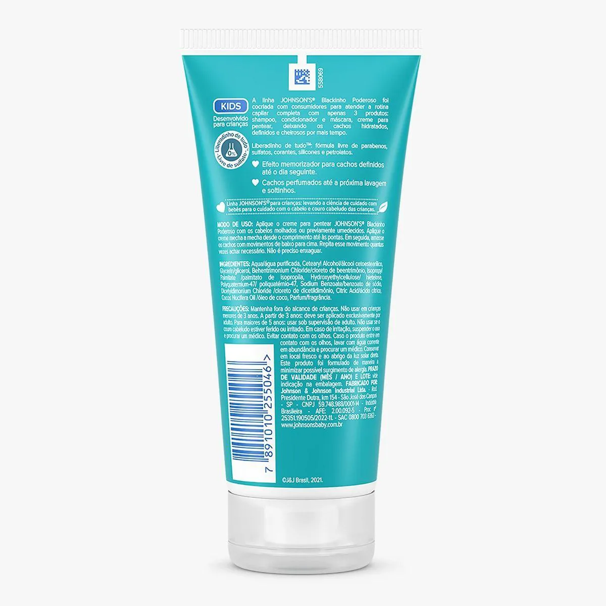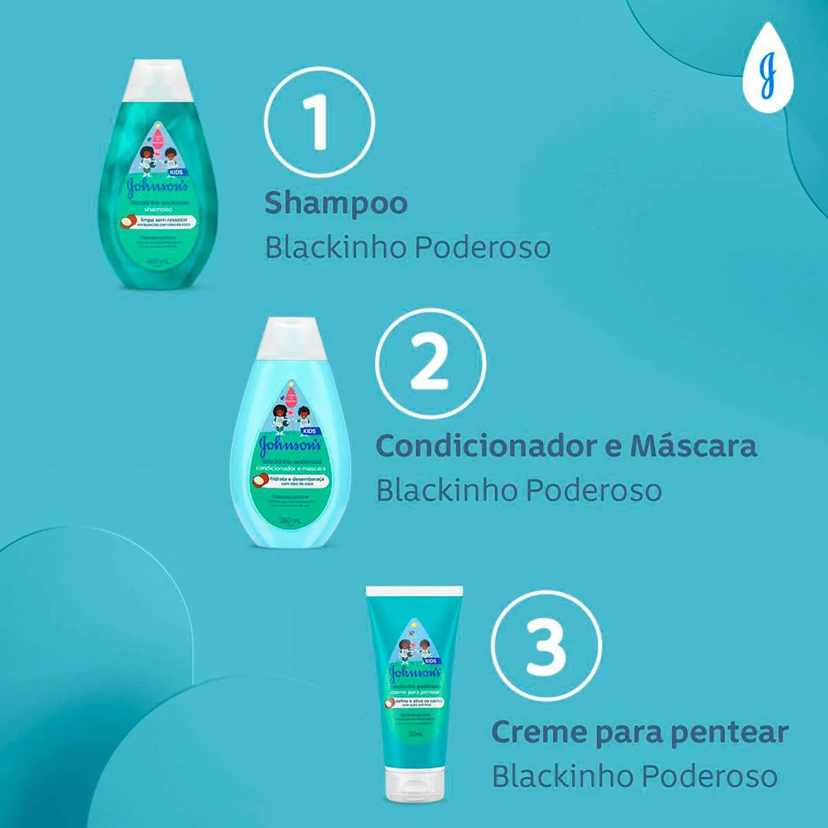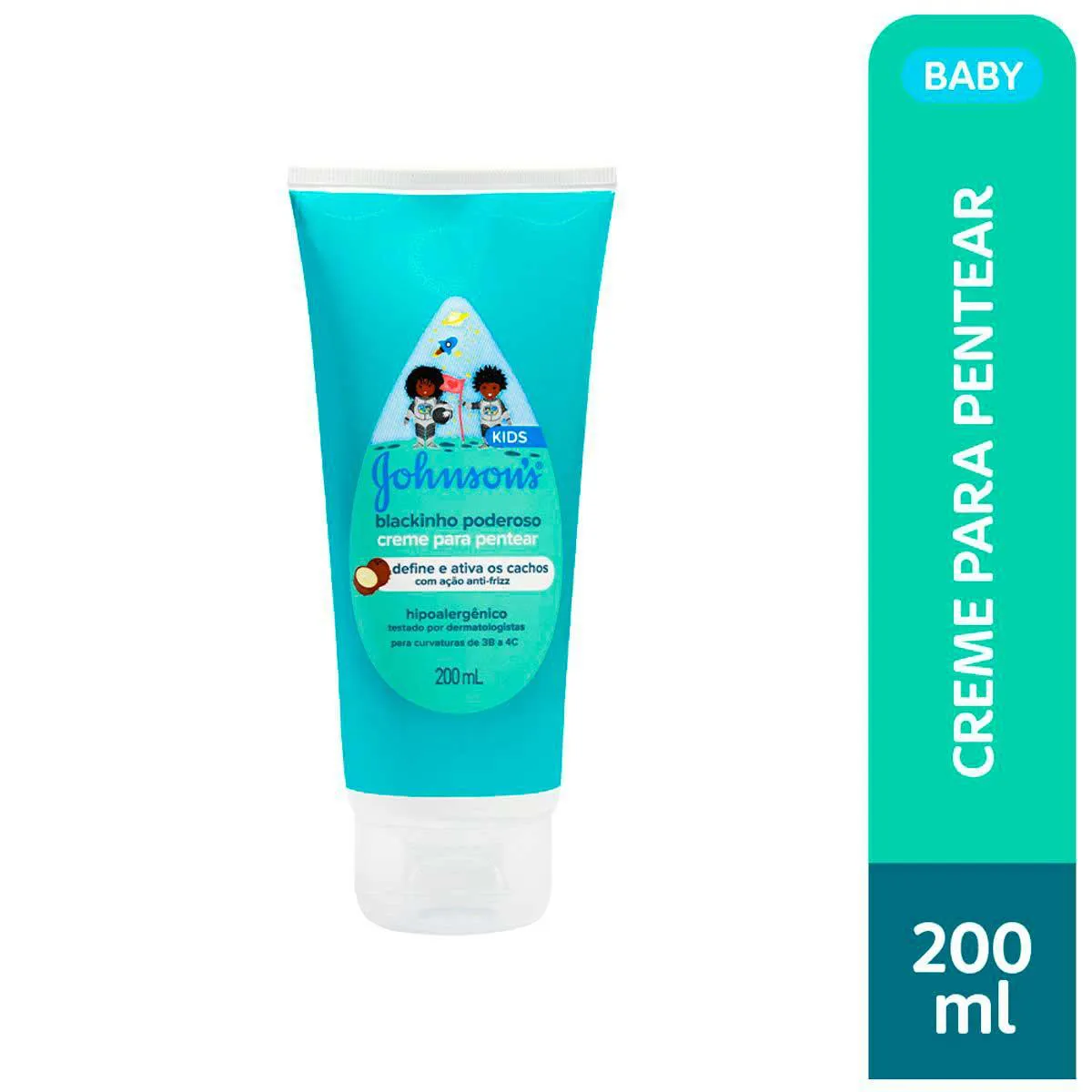 Johnson's Blackinho Poderoso é um Creme de pentear para o cuidado dos cabelos das crianças, especialmente para curvaturas de 3B a 4C. Sua fórmula com óleo de coco define e ativa os cachos, deixando eles perfumados e soltinhos até a próxima lavagem, além de contar com a exclusiva tecnologia Chega de Lágrimas, que evita irritação nos Olhos.