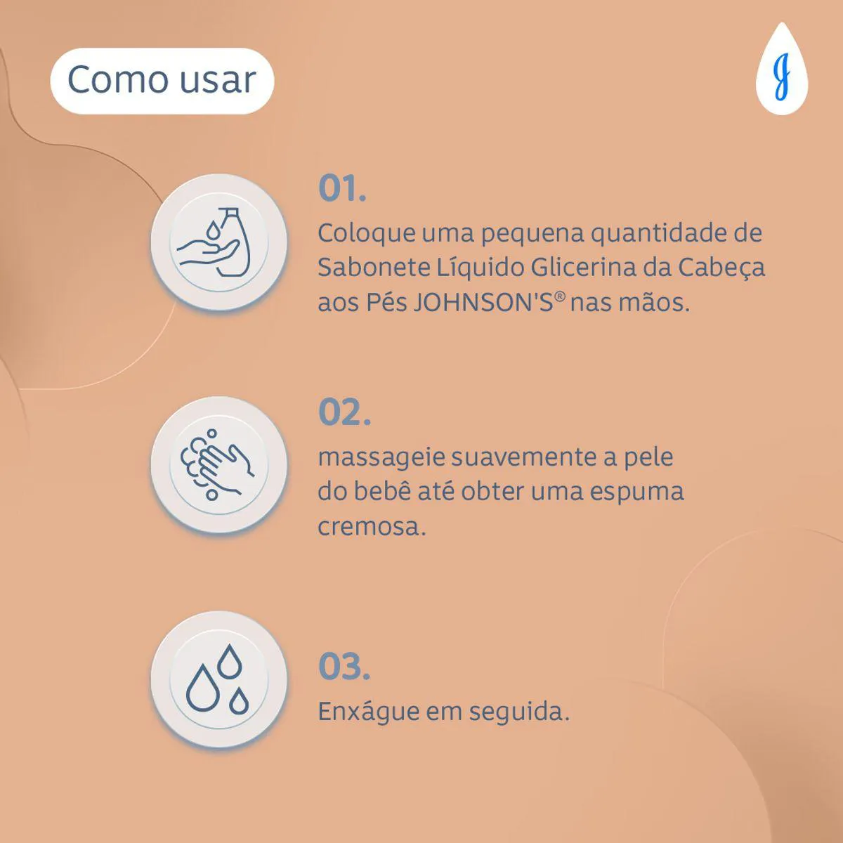 Coloque uma pequena quantidade de Johnson 's® Sabonete Líquido de Glicerina Da Cabeça aos Pés nas Mãos. Espalhe na pele do bebê, massageando-a em movimentos circulares. Enxágue em seguida.