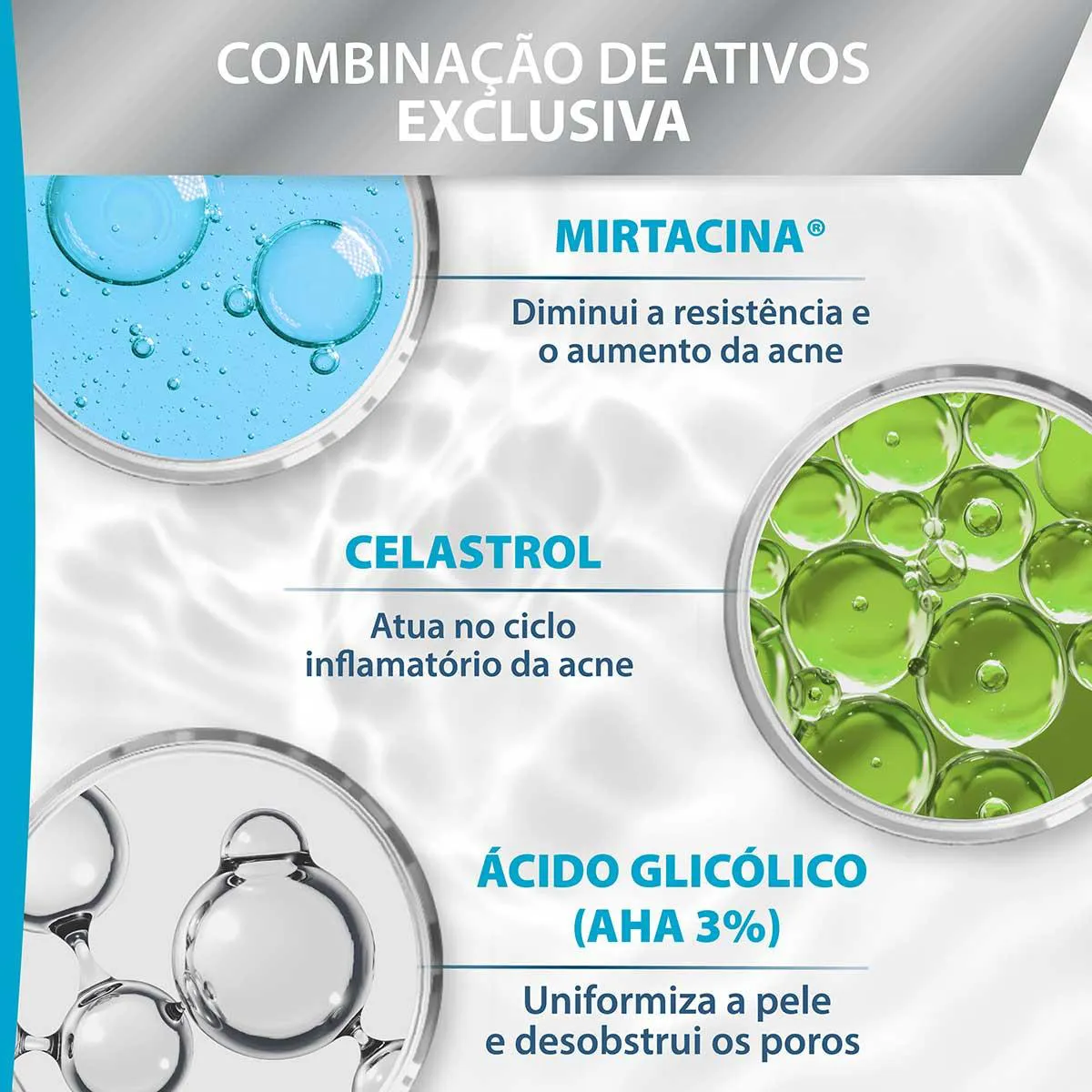 Ingrediente ativo patenteado exclusivo que auxilia no ciclo inflamatório da acne.