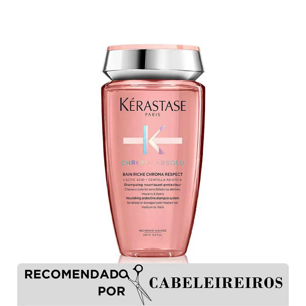 Shampoo Kérastase Chroma Absolu Bain Riche Chroma Respect é um protetor rico e nutritivo. Esta fórmula de gel transparente rosa claro limpa e nutre o Cabelo, respeitando e preservando a cor do cabelo do desbotamento. Enriquecido com Ácido Láctico , ajuda a selar a porosidade da fibra, suavizando a superfície para máxima retenção de cor e menos frizz induzido pela cor. * RESULTADO: Anti-frizz Cuidado da Cor Maciez * SUGESTÕES DE USO: 1.Nos cabelos molhados, retire cuidadosamente o excesso de água antes de aplicar o shampoo, com a quantidade do tamanho de uma noz; 2.Aplique nas 5 zonas principais do cabelo; 3.Adicione água e emulsione; 4.Deixe agir entre 2 e 5 minutos; 5.Enxague bem. * OBSERVAÇÕES: Imagem Meramente Ilustrativa * ITENS INCLUSOS: 1 Kérastase Chroma Absolu Bain Riche Chroma Respect Shampoo 250ml
