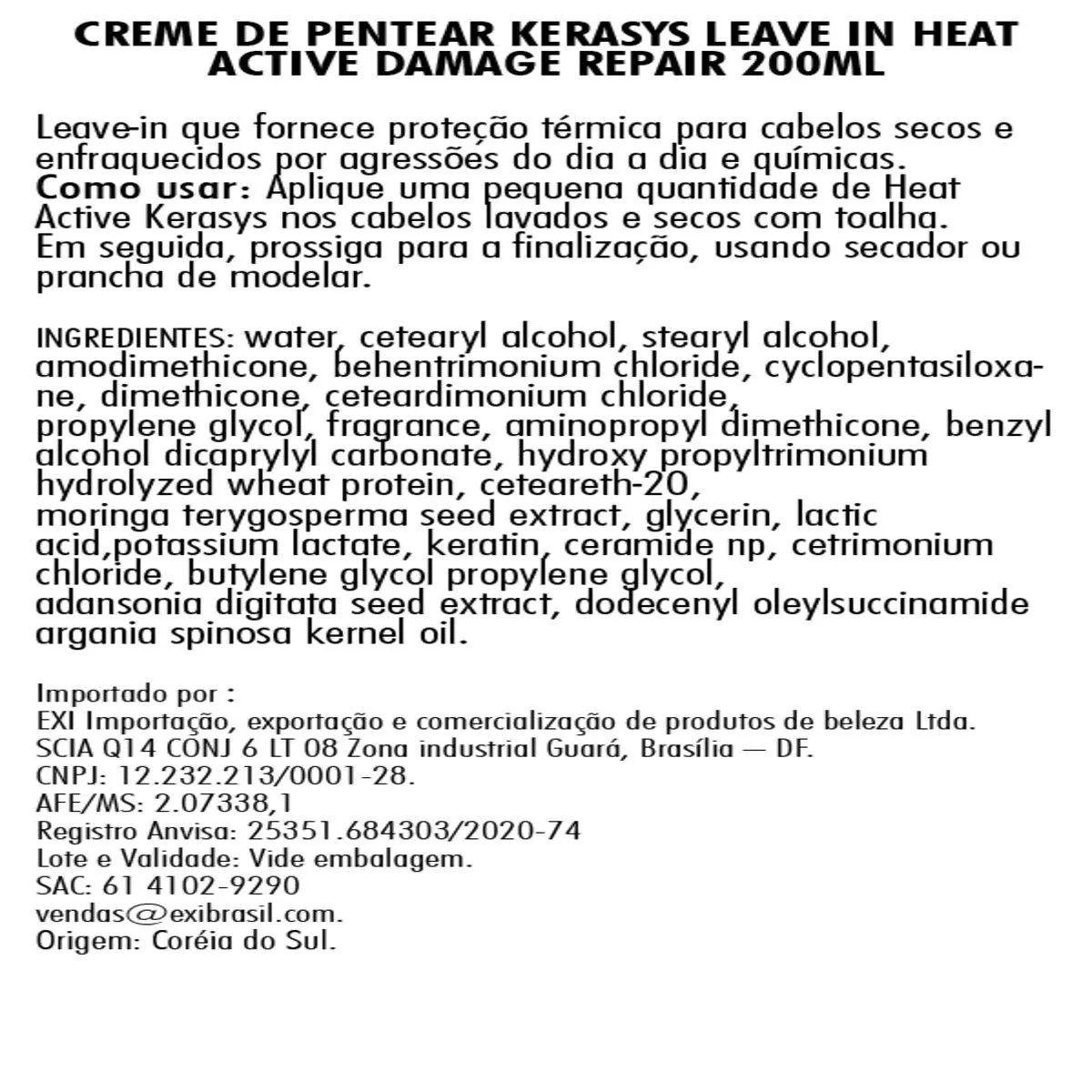 Kerasys Heat Active Damage Repair é um é um leave-in Finalizador destinado à nutrição e proteção termoativada, indicado para todos os tipos de cabelos. Formulado com ingredientes especiais, esse leave-in possui ação termo-ativa: seus nutrientes são ativados com a ação do calor para proteger seus cabelos das agressões térmicas proporcionando maciez e vida.