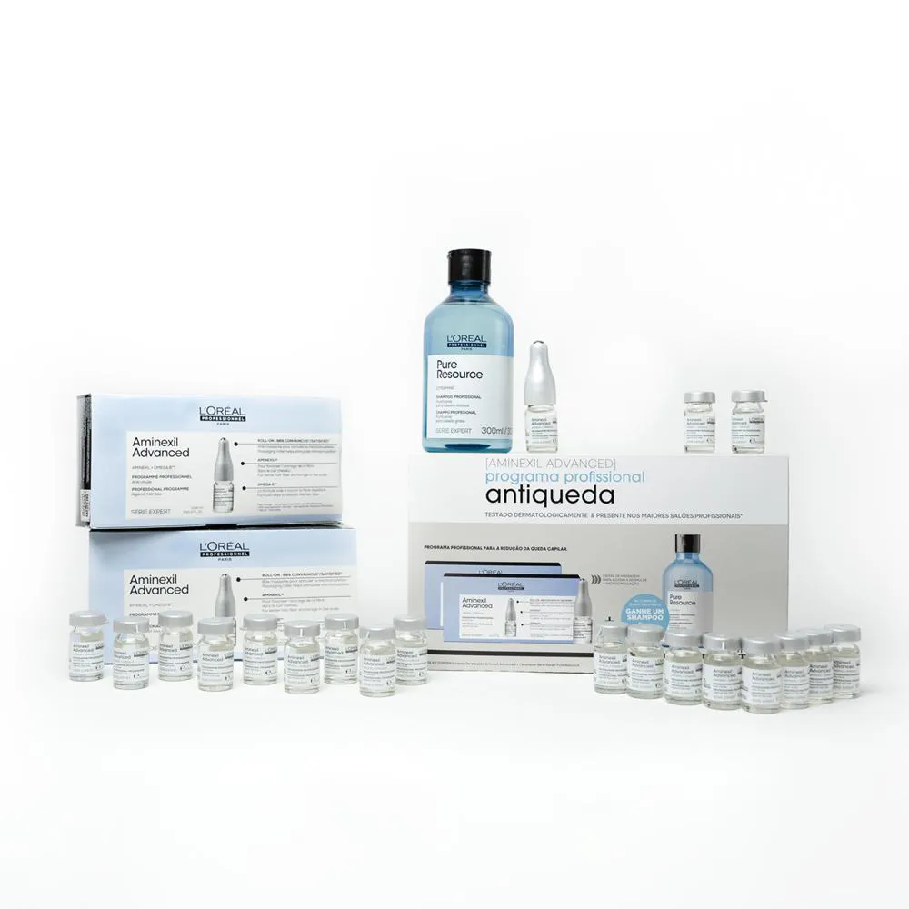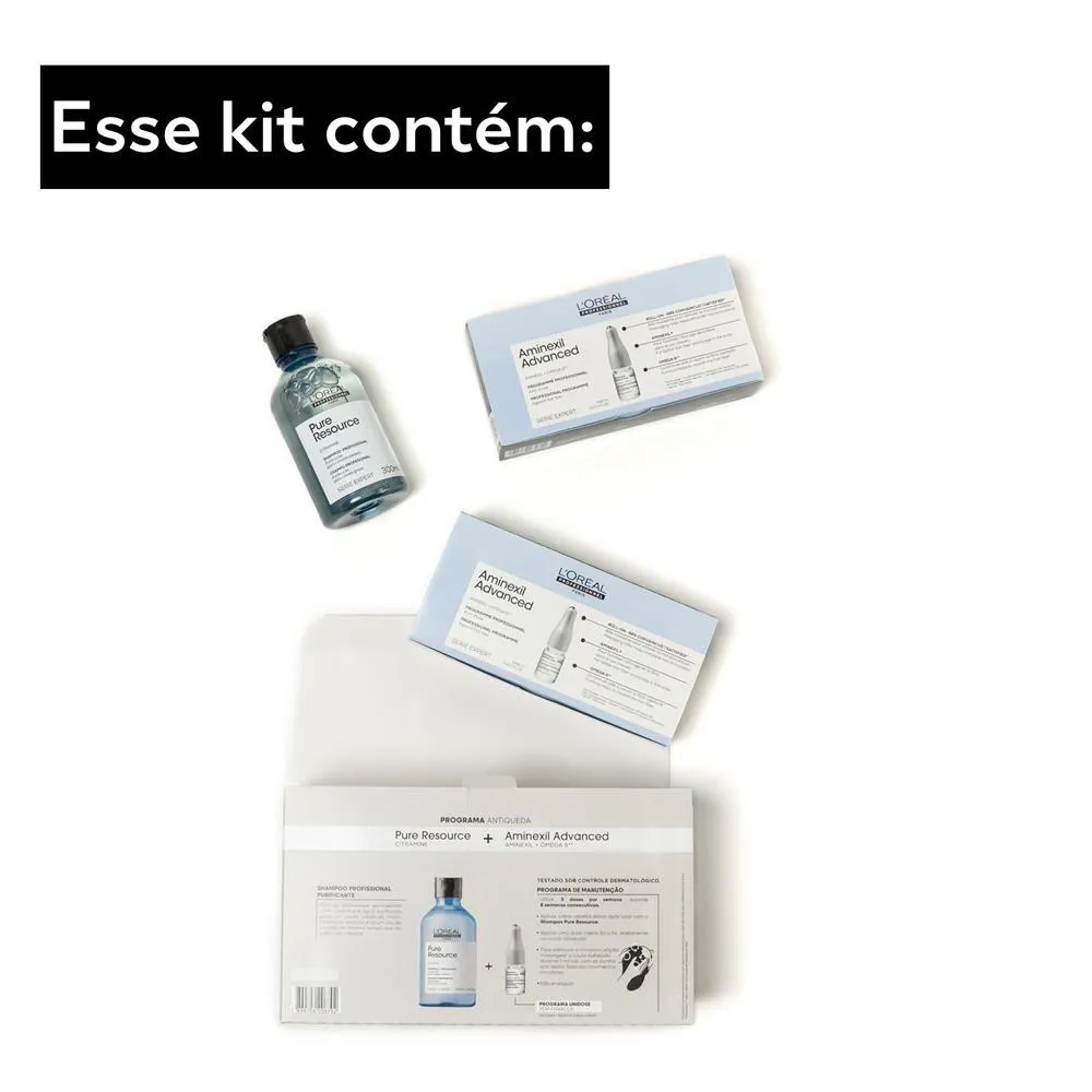 A solução profissional para a redução da queda capilar de L’Oréal Professionnel.Kit L'Oréal Professionnel Serie Expert Pure Resource possui um complexo antiqueda dupla ação, limpa e estimula a raiz dos fios no couro cabeludo enquanto protege a densidade do Cabelo, neutralizando o enriquecimento do colágeno ao redor do bulbo capilar, melhora a ancoragem dos fios no couro cabeludo.Sua fórmula também é enriquecida por Ômega 6, ingrediente que estimula a atividade favorecendo a construção da fibra capilar. * RESULTADO: Controlo de QuedaLimpeza * SUGESTÕES DE USO: 1.Com o cabelo limpo e úmido;2.Aplique diretamente no couro cabeludo fazendo movimentos circulares;3.Massageie o couro cabeludo durante 1 minuto com as pontas dos dedos fazendo movimentos circulares.;4.Enxague.Dica: Utilize 3 doses por semana durante 8 semanas consecutivas. * OBSERVAÇÕES: Imagem Meramente Ilustrativa * ITENS INCLUSOS: 20 L'Oréal Professionnel Serie Expert Ampola Aminexil Advanced 6ml cada1 L'Oréal Professionnel Pure Resource Shampoo 300ml