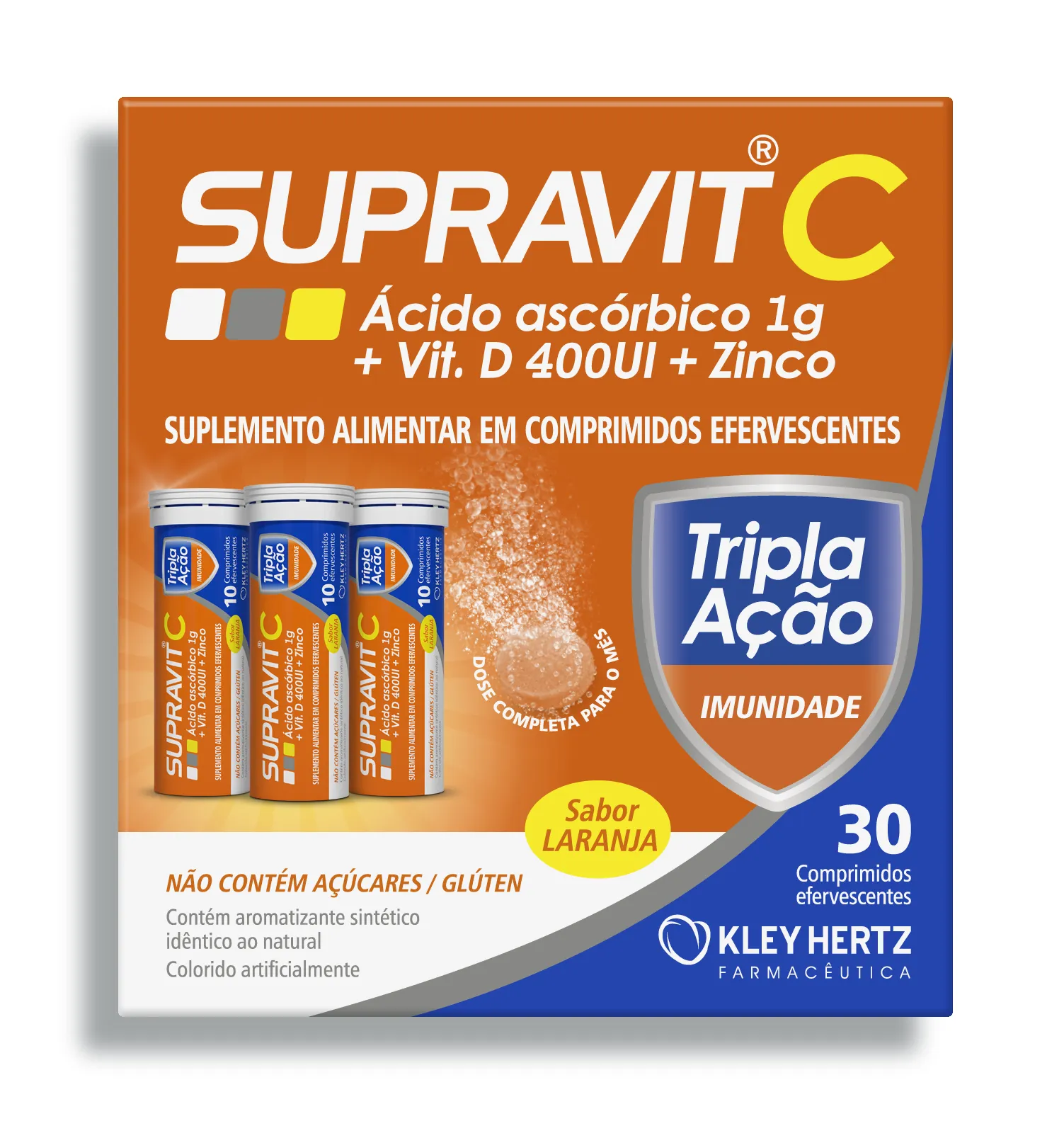 Cada comprimido efervescente de Supravit C Tripla Ação contém 1g de ácido ascórbico (Vitamina C), 400 UI de vitamina D e 10mg de zinco.