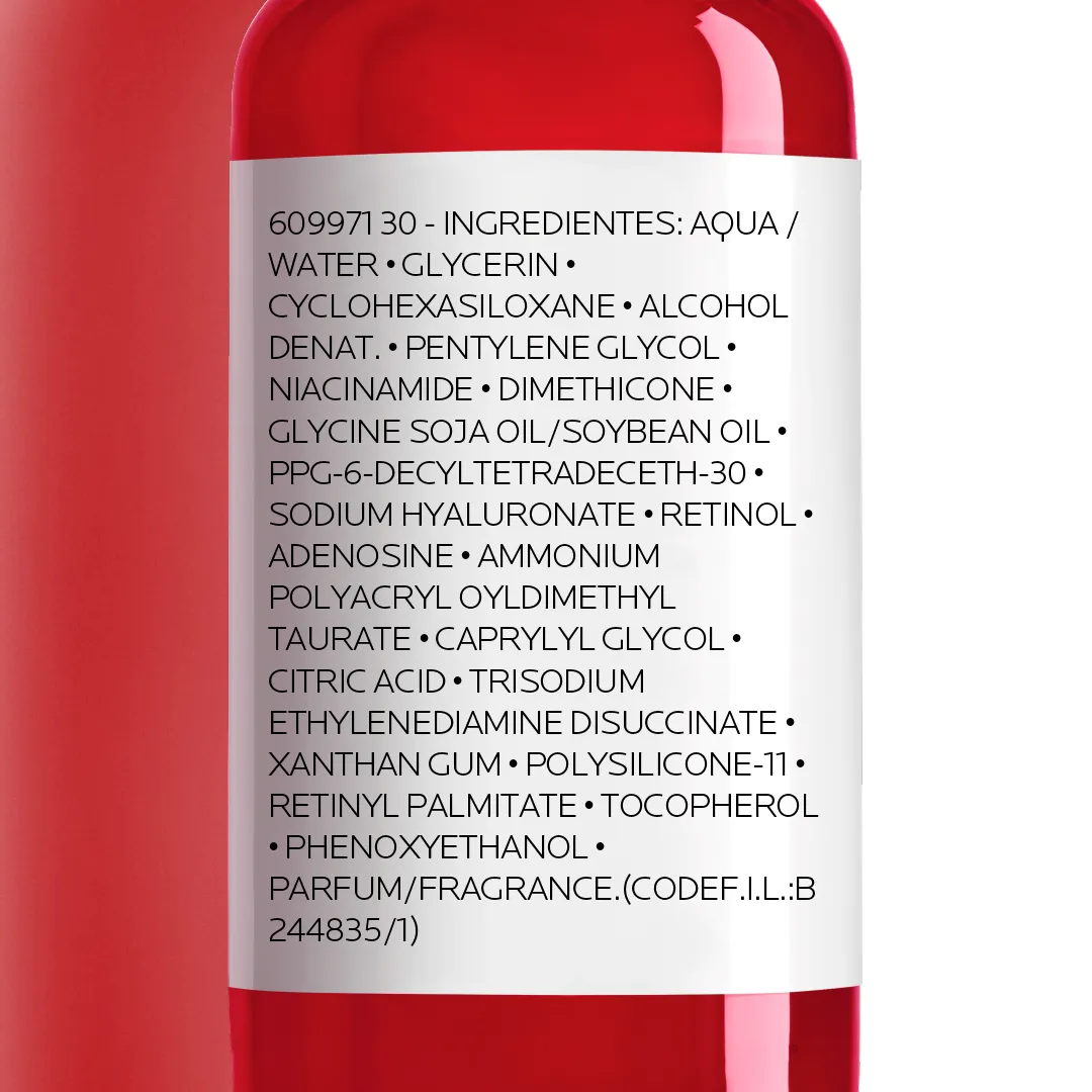609971 30 - Ingredients : Aqua / Water, Glycerin, Cyclohexasiloxane, Alcohol Denat, Pentylene Glycol, Niacinamide, Dimethicone, Glycine Soja Oil / Soybean Oil, Ppg-6-decyltetradeceth-30, Sodium Hyaluronate, Retinol, Adenosine, Ammonium Polyacryloyldimethyl Taurate, Caprylyl Glycol, Citric Acid, Trisodium Ethylenediamine Disuccinate, Xanthan Gum, Polys Ilicone-11, Retinyl Palmitate •tocopherol, Phenoxyethanol, Parfum / Fragrance.