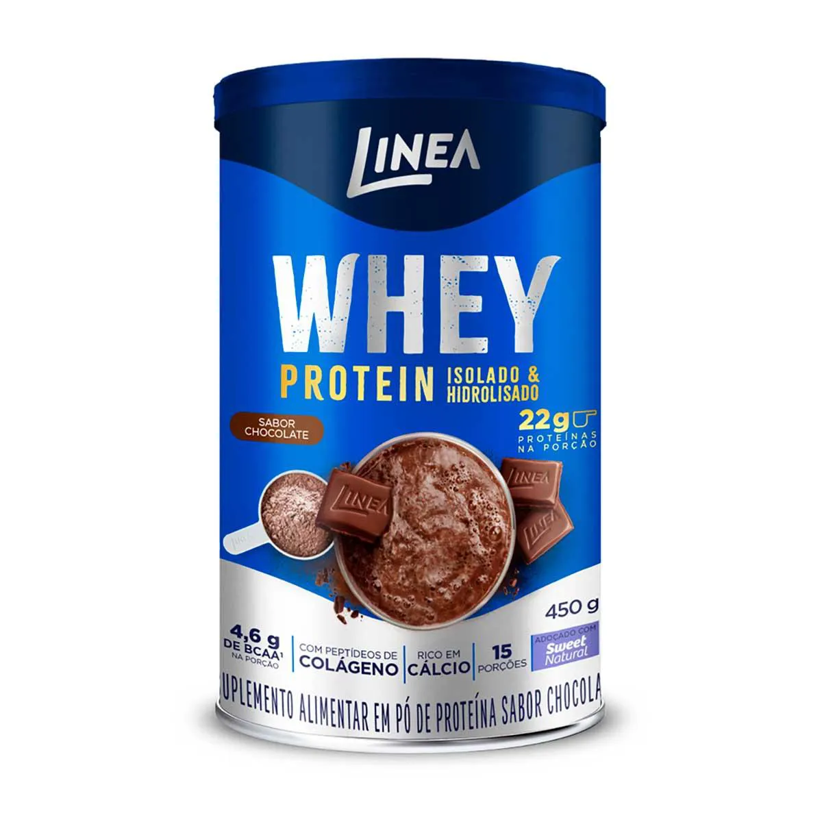 Linea Whey Protein Isolado e Hidrolisado é um suplemento alimentar em pó de proteína sabor chocolate.
