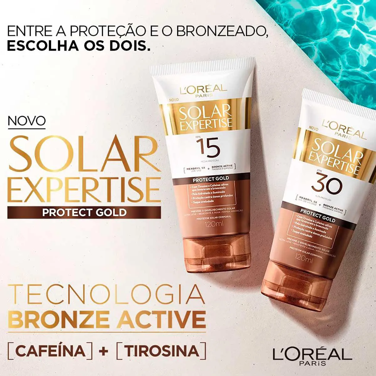 Indicado para todos os Tipos de pele, o Protetor Solar L'Oréal Expertise Protect Gold possui em sua fórmula o filtro exclusivo Mexoryl SX, que protege a pele contra os raios UVA e UVB, prevenindo o envelhecimento solar e a exclusiva tecnologia Bronze Active, que é a união dos ativos Tirosina e Cafeína, que juntos favorecem o bronzeado, deixando a pele iluminada e radiante.