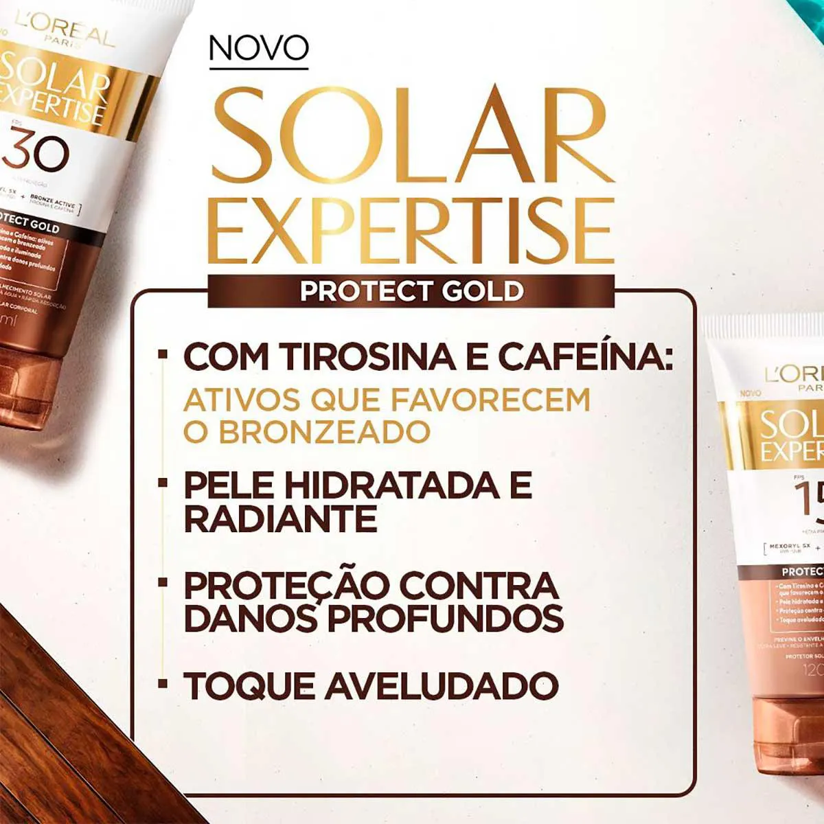 Expertise Protect Gold é o protetor solar 2 em 1 da L'Oréal. Ele associa a proteção contra os danos provocados pela exposição ao sol com ativos que auxiliam o bronzeado.