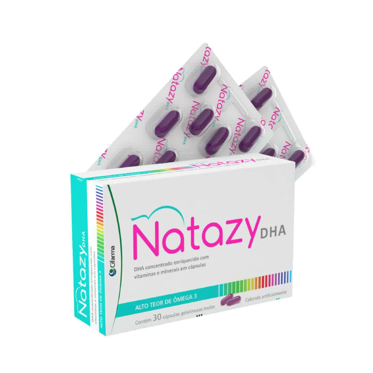 Natazy DHA é um suplemento alimentar rico em vitaminas e minerais, indicado para o período da gestação à amamentação. Desenvolvido especialmente para mulheres grávidas brasileiras, ele traz em sua composição vitaminas A, B1, B2, B3, B6, ácido fólico, B12, C, D, E, Ferro e Zinco.