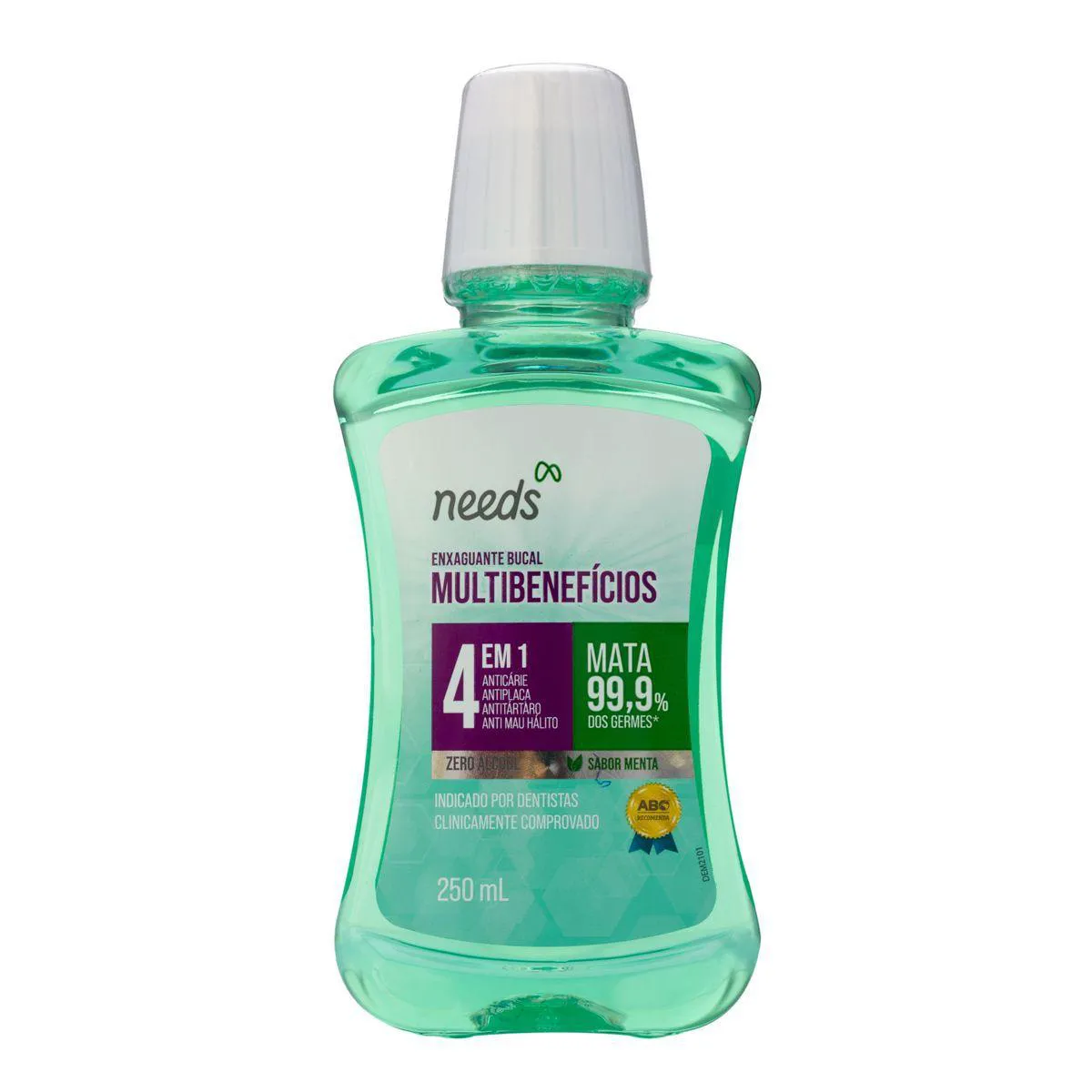 O Needs Ação 4 em 1 é um enxaguante bucal multibenefícios sabor de menta, com fórmula exclusiva sem álcool e sem parabenos, que reduz até 99,9% dos germes, combate as bactérias causadoras da placa, cáries, tártaro e mau hálito.