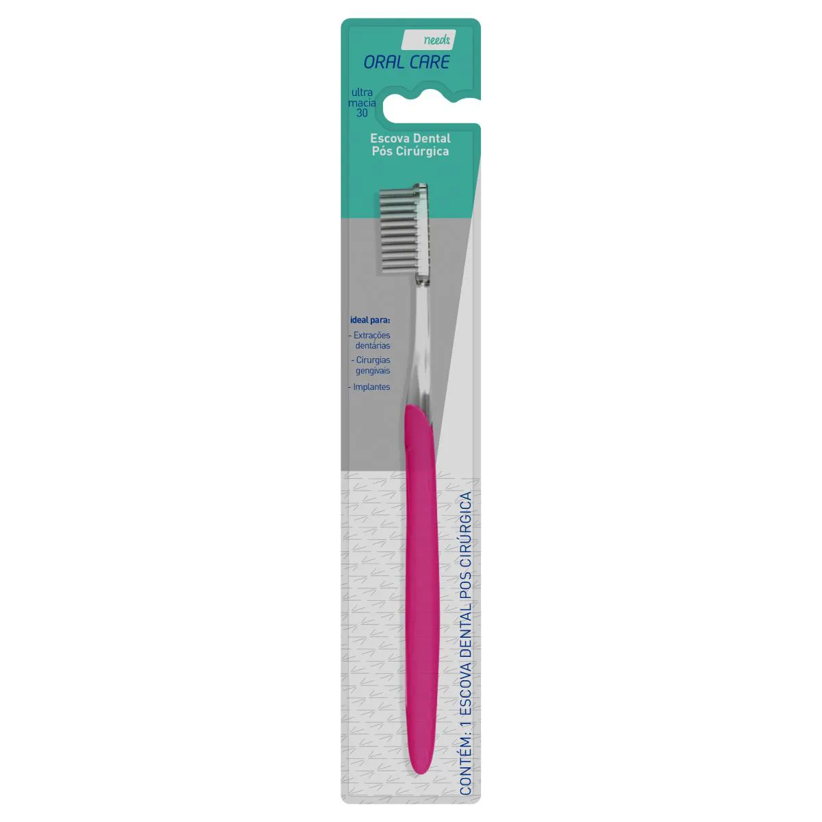 A Escova de Dente Needs Pós Cirúrgica foi desenvolvida especialmente para cuidar da sua higiene bucal após processos cirúrgicos e/ou implantes. Ela é ultramacia e possui cerdas suaves com pontas arredondadas e cabeça pequena, o que permite higienizar de maneira eficaz e suave a região recém operada.