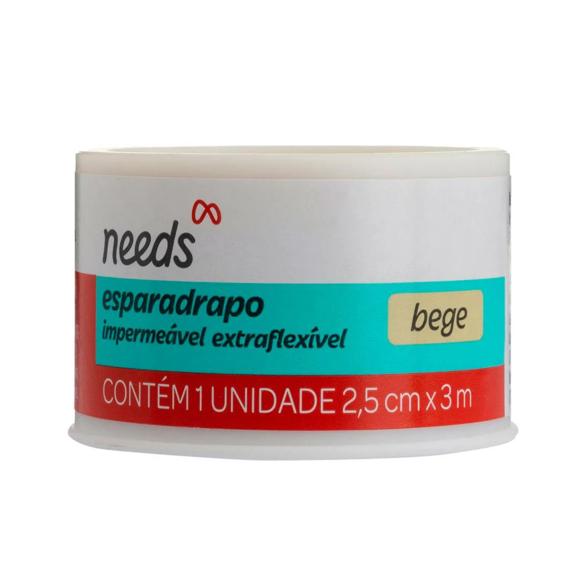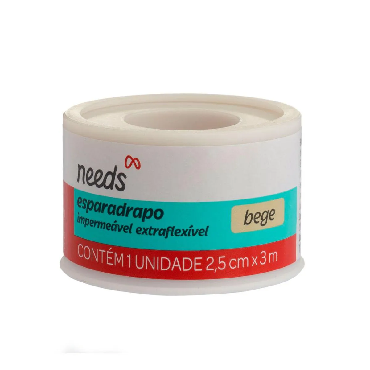 O Esparadrapo Bege Impermeável Needs é feito de tecido 100% algodão com tratamento acrílico e adesivo a base de óxido de zinco, borracha natural e resinas.