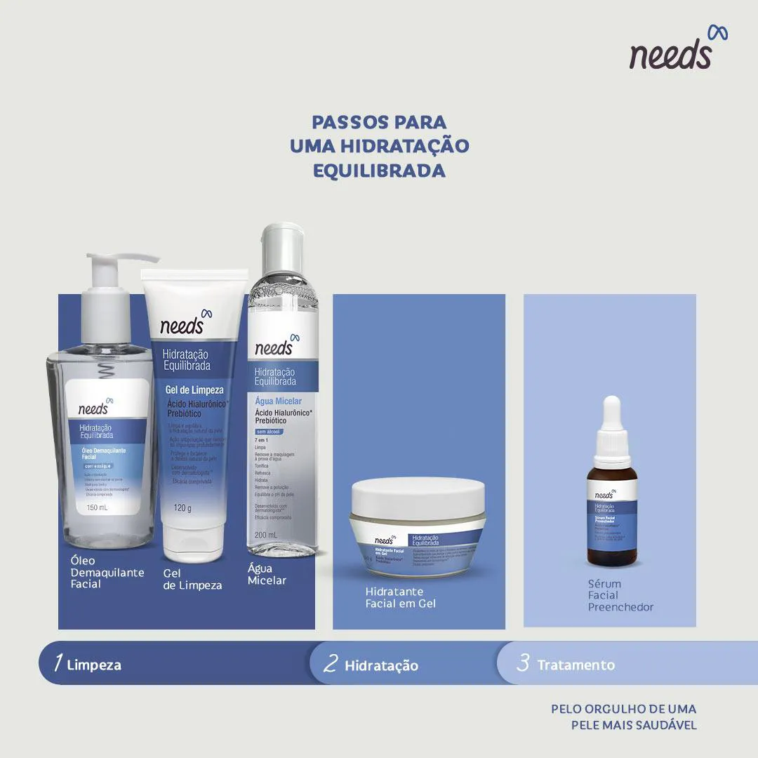 Needs Hidratação Equilibrada é um gel hidratante facial que combina ácido hialurônico e prebiótico, além de ser enriquecido com ativo especial do grão de café arábica, que garante alto poder de hidratação em uma fórmula 100% livre de óleos e desenvolvida com dermatologista. Ele possui textura aquagel refrescante de absorção ultrarrápida.