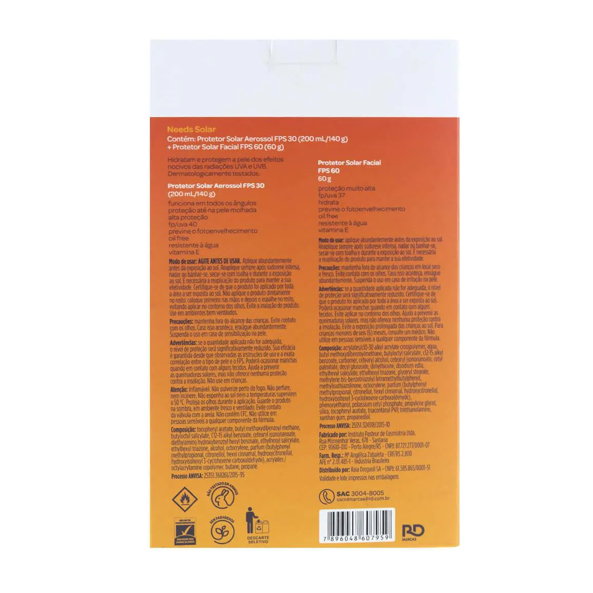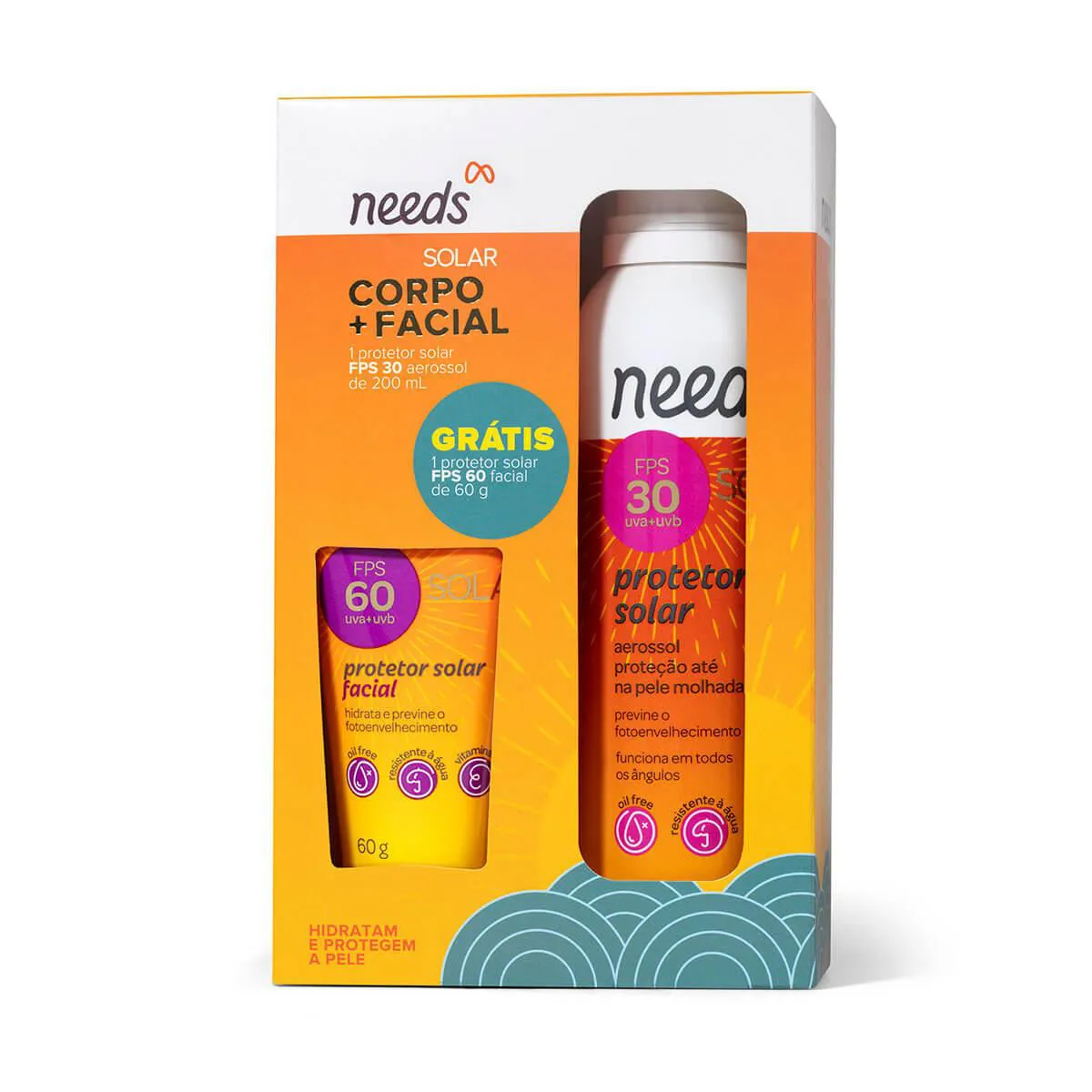 O Kit Protetor Solar Aerossol Needs FPS 30 + Protetor Solar Facial Needs FPS60 é composto por: