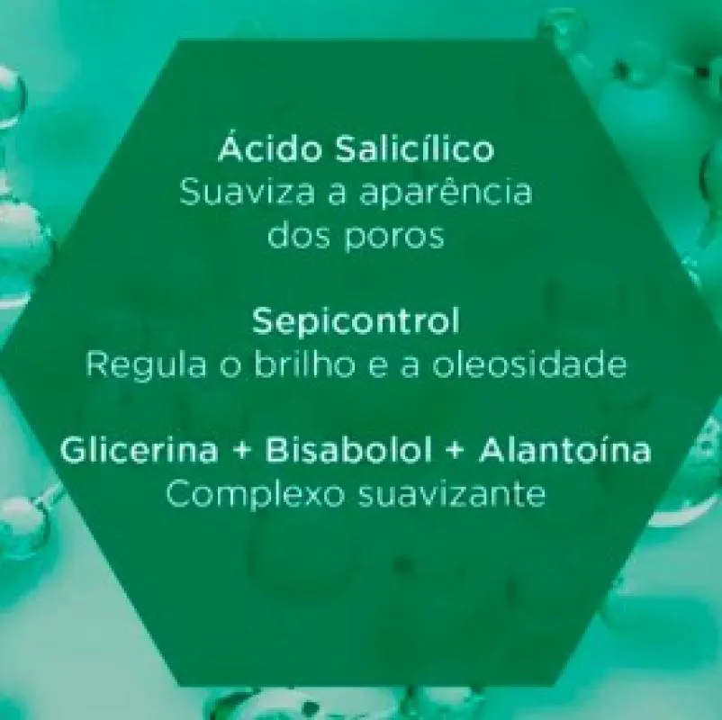 Benefícios: Limpa profundamente; reduz a oleosidade da pele; desobstrui os poros; ação Anti-Cravos / Evita e reduz cravos; auxilia na limpeza diária. Não-comedogênico. Ativos: Ácido Salicílico: acelera o processo de renovação celular e reduz a acne; Sepicontrol: regula a produção de sebo; limpa profundamente a pele, desobstruindo poros e reduzindo a formação de cravos e espinhas para cuidado diário de peles mistas a oleosas e/ou acneicas.