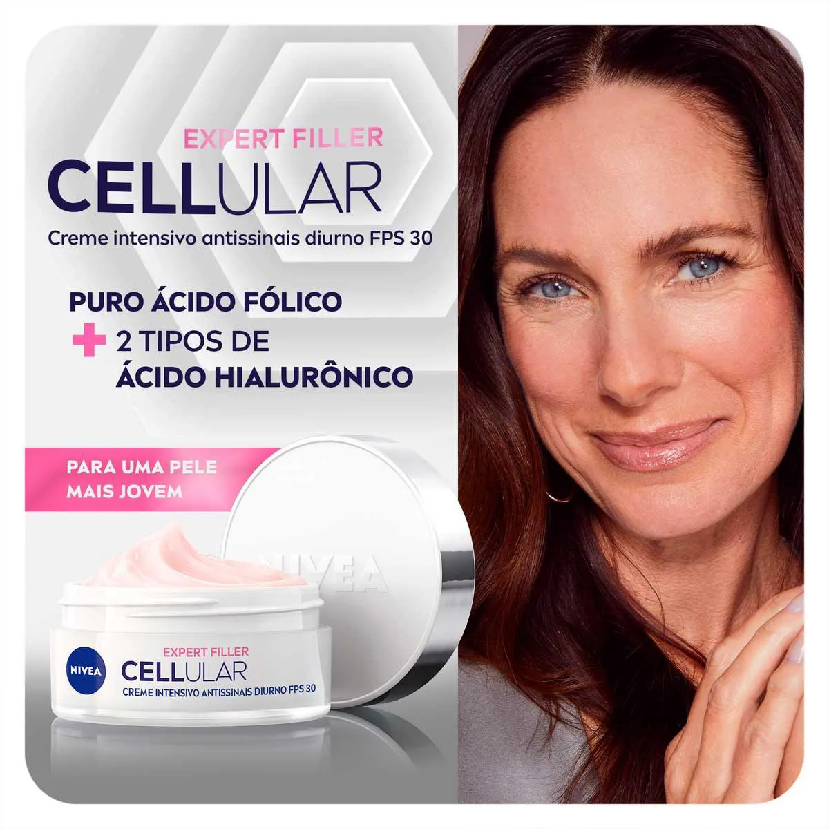Seu uso proporciona uma sensação de efeito lifting e pele mais jovem e firme, combatendo rugas e linhas de expressão. NIVEA Creme Facial Antissinais Cellular Filler Dia FPS 30 também conta com textura leve e rápida absorção. Além disso, o creme tem proteção FPS 30, protegendo sua pele dos raios UVA/UVB. Cuide de você e conquiste uma pele jovem e saudável.