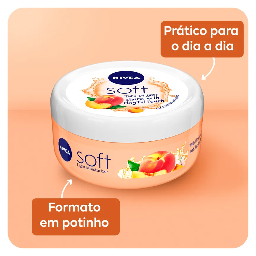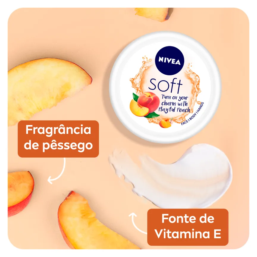 Nivea Soft Pêssego é um creme hidratante de edição limitada, indicado para o Corpo, Mãos e Rosto.