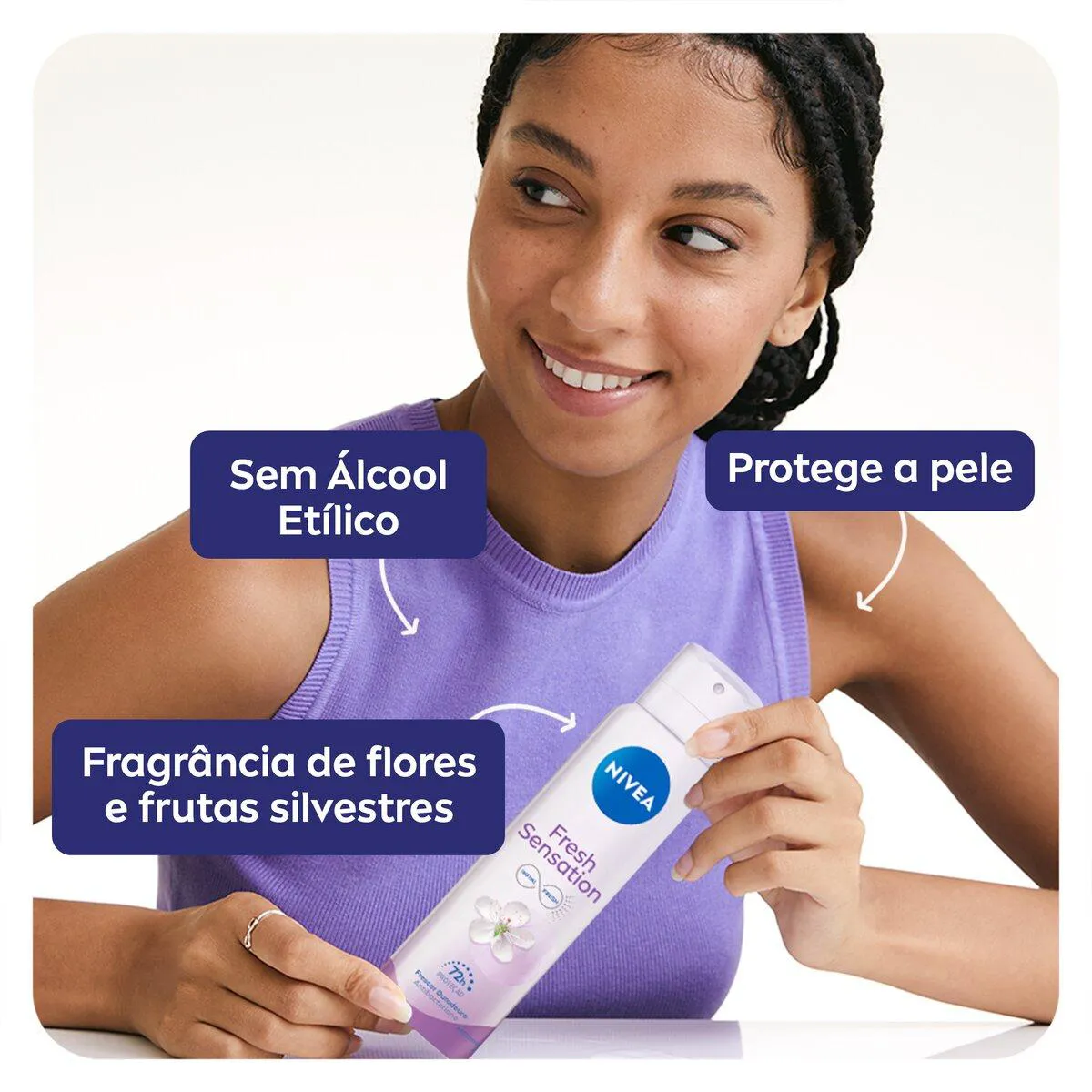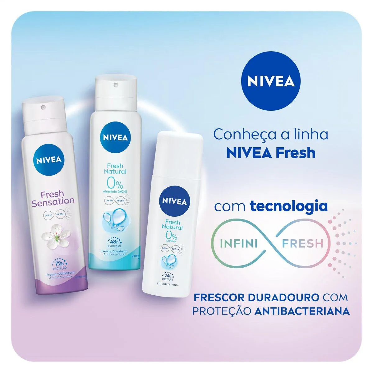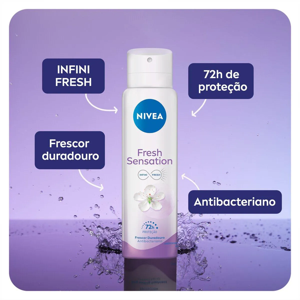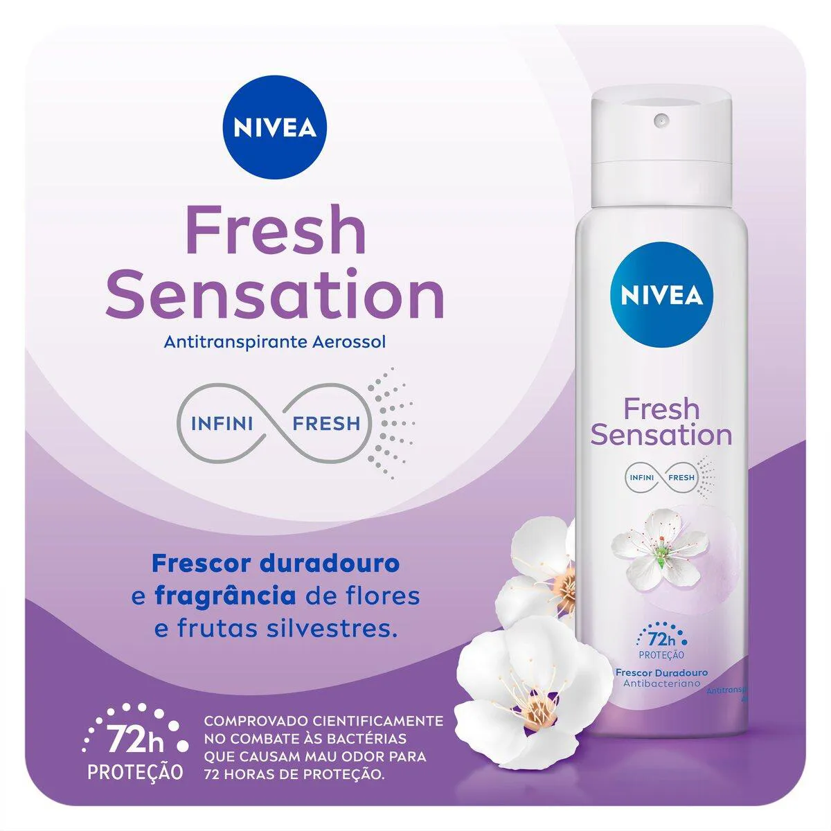 O Nivea Fresh Sensation Aerossol é um desodorante feminino que conta com o exclusivo Infini Fresh, que protege as axilas por 72 horas com efeito de frescor duradouro antibacteriano e uma fragrância fresca de flores e frutas silvestres. Sua fórmula é cientificamente comprovada no combate das bactérias* que causam mau odor.