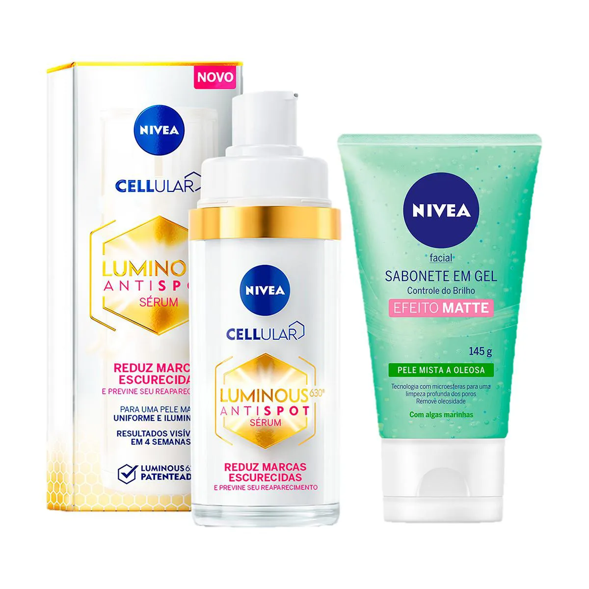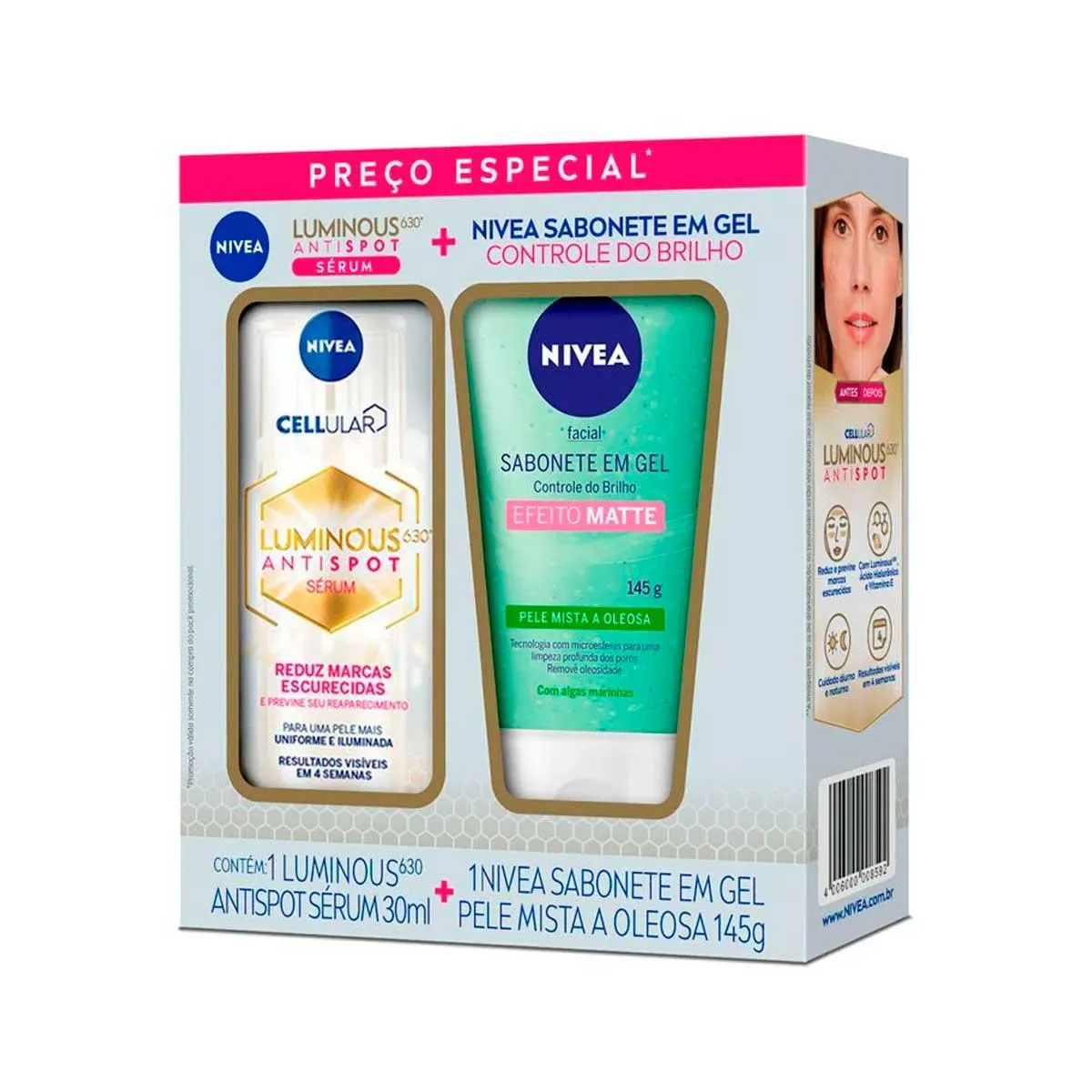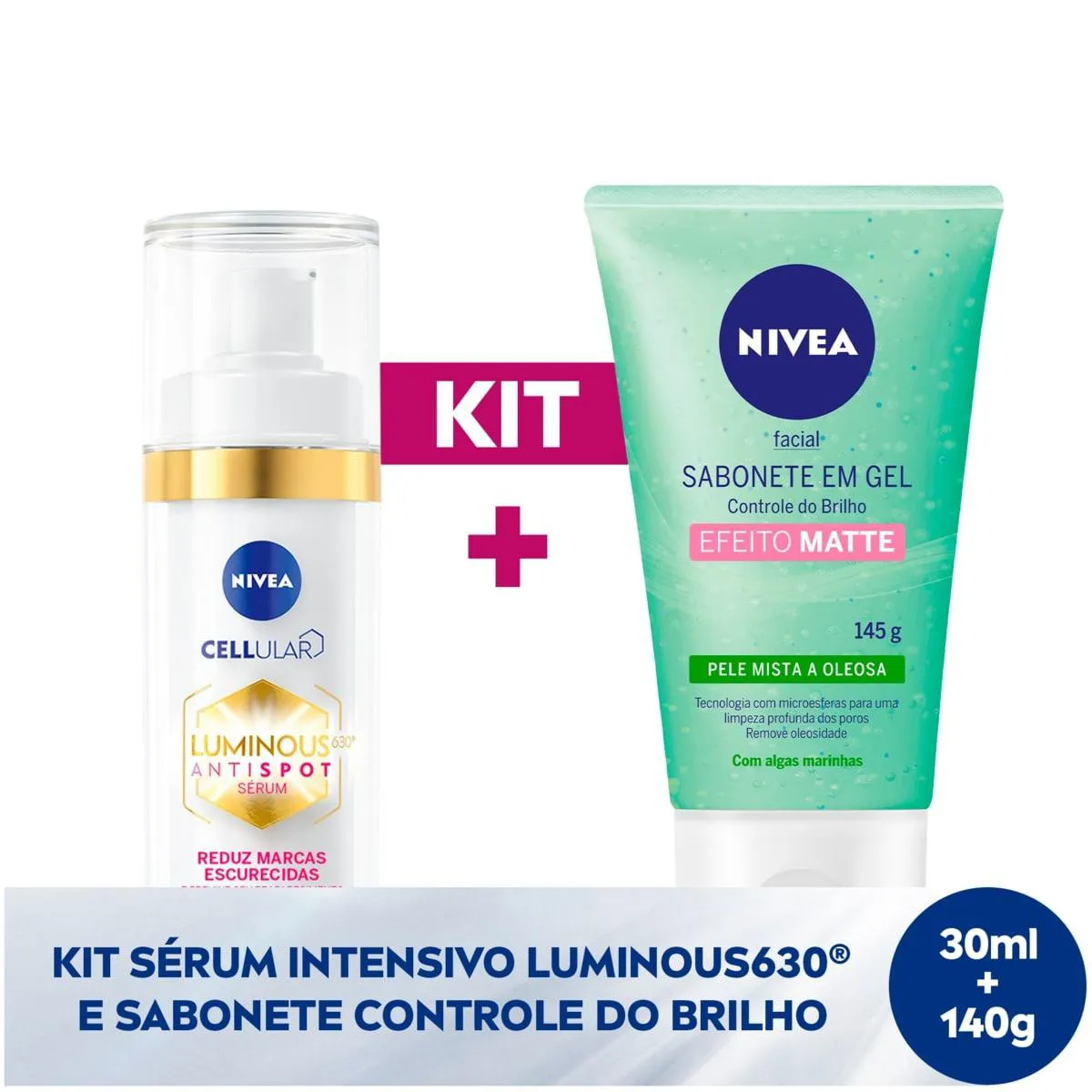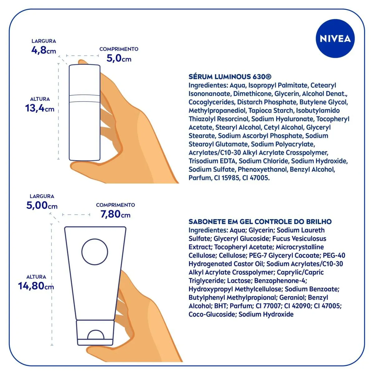 O Kit Nivea Luminous 630 é composto por 1 sérum intensivo + 1 sabonete em gel controle de brilho.