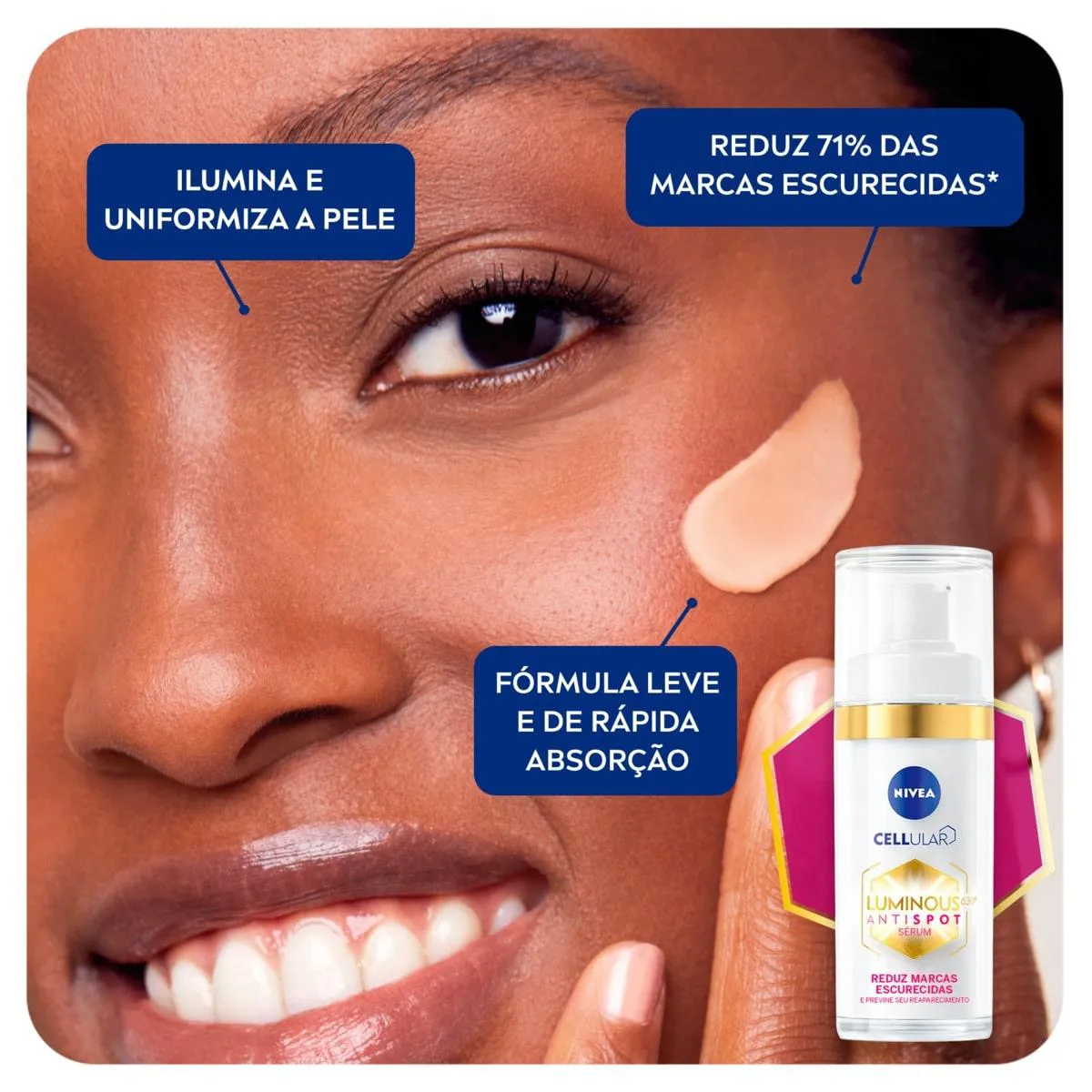 O sérum Intensivo Nivea Luminous 630 ajuda a reduzir manchas escuras e evita o reaparecimento em 4 semanas de uso. Ele conta com uma fórmula enriquecida com ácido hialurônico e Vitamina E que ajuda a deixar a pele uniforme e luminosa.