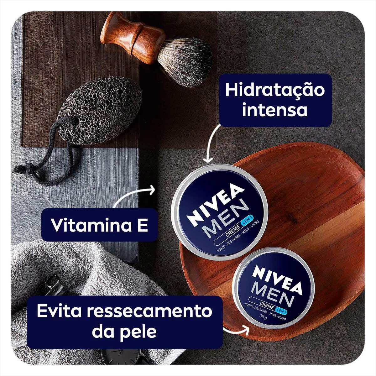 Nivea Men Creme 4 em 1 é ideal para o cuidado da pele do Rosto, Corpo e Mãos do homem, além de ser um excelente pós-barba. Hidrata intensamente a pele sem deixá-la oleosa, contribui para seu rejuvenescimento e melhora de aspecto com a presença da Vitamina E.