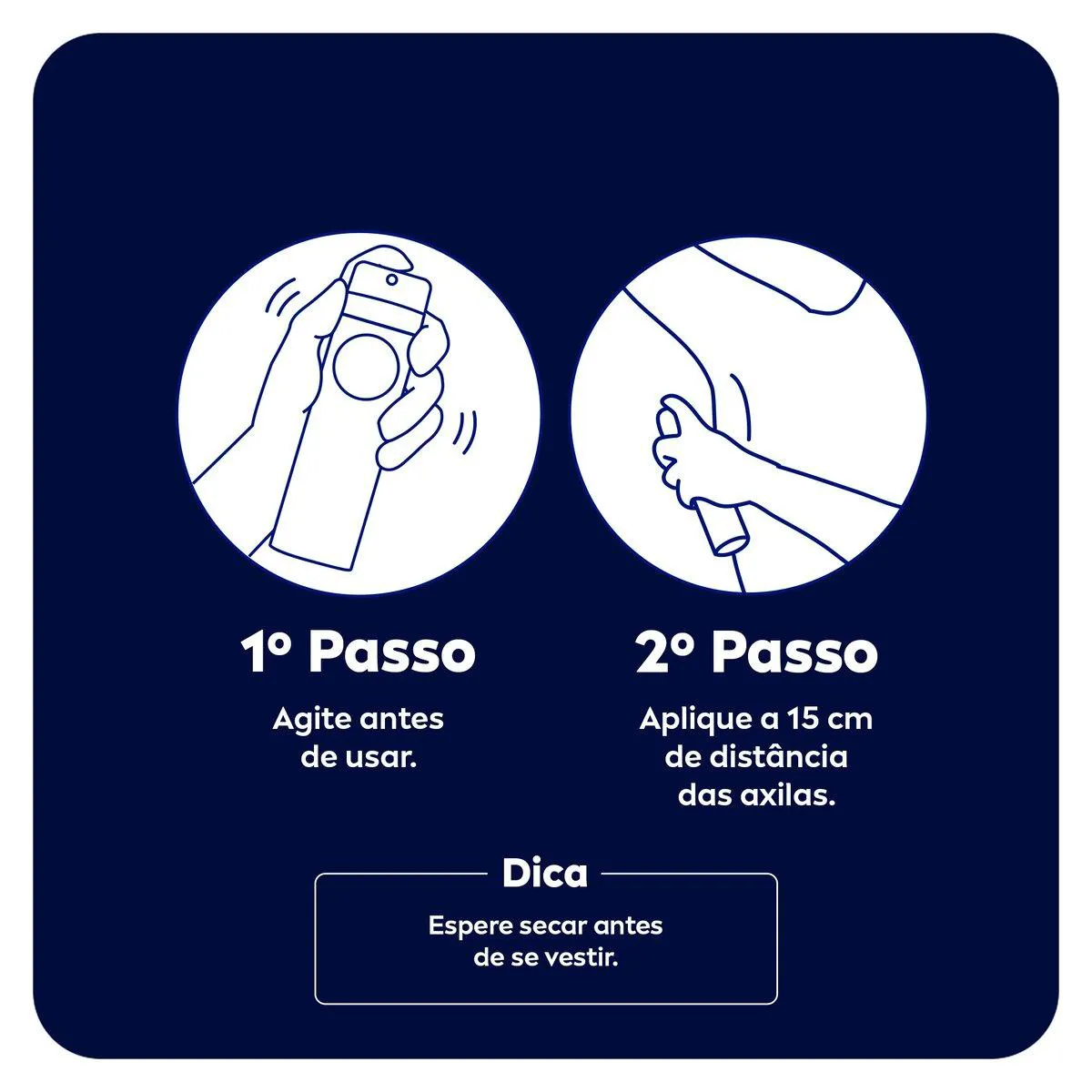 Agite antes de usar. Utilize somente nas axilas a pelo menos 15 cm de distância. Não use se a pele estiver irritada ou lesionada. Espere secar antes de se vestir. Em caso de funcionamento anormal da válvula, vire o frasco para baixo e agite bem.