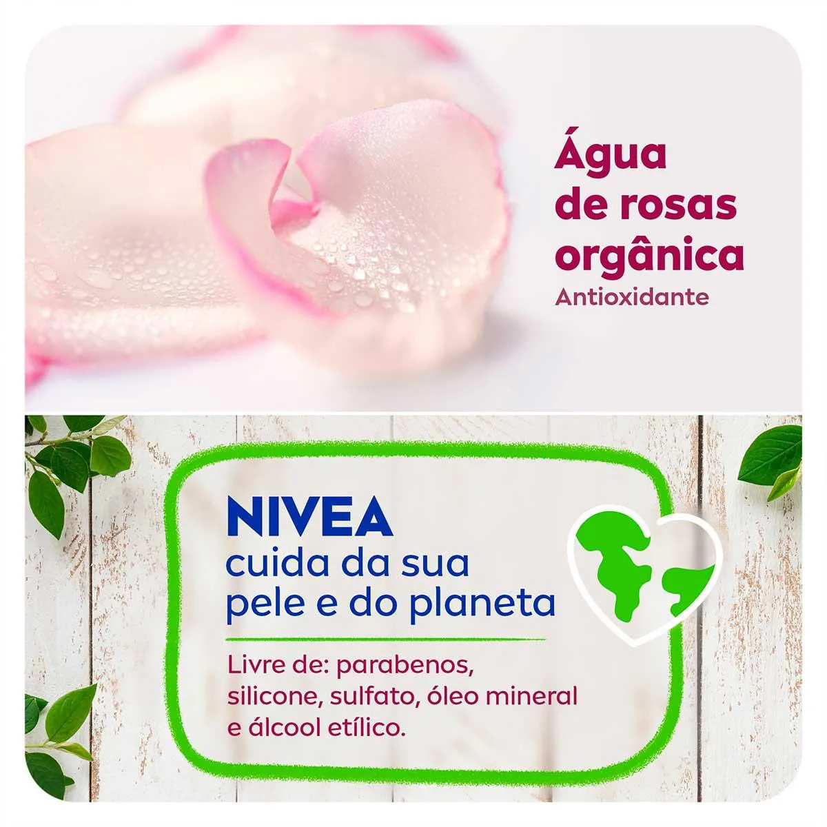 - Fórmula com água de rosas orgânica, com ação antioxidante.