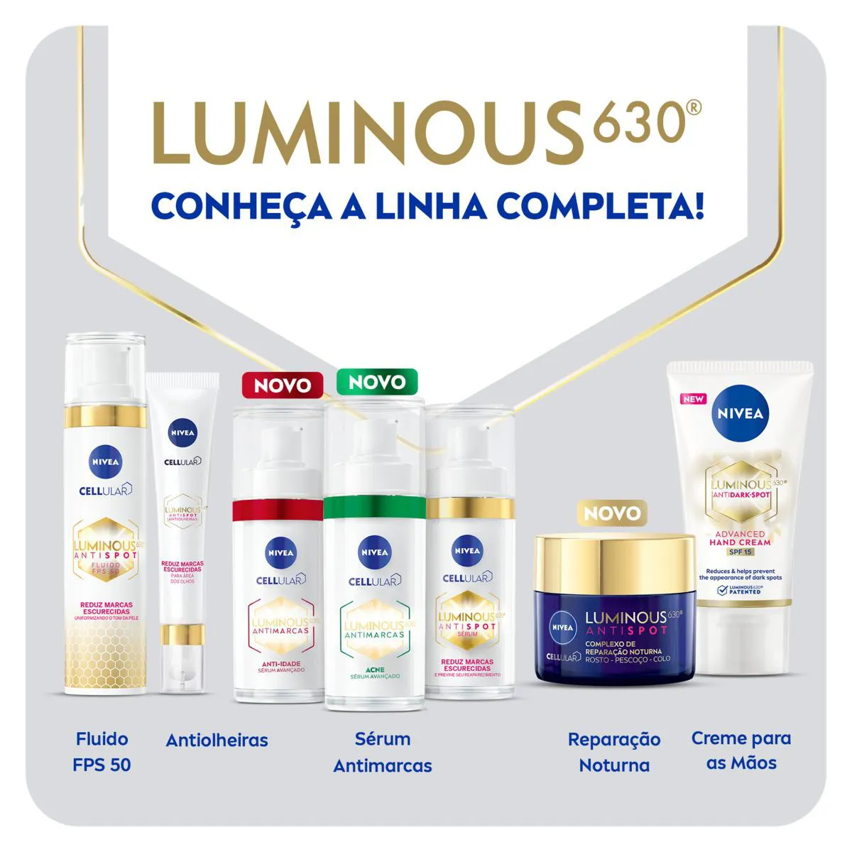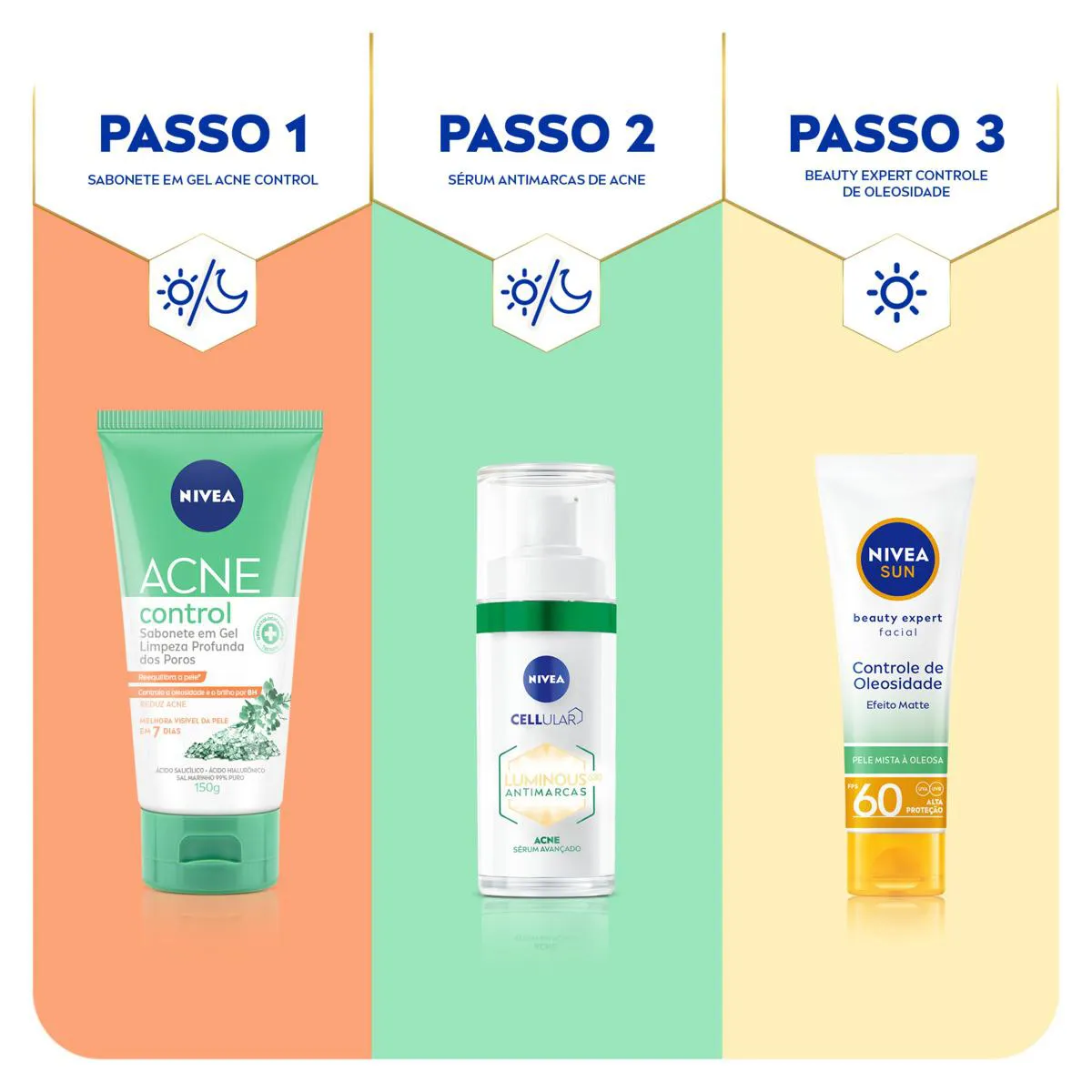 Com fórmula desenvolvida para pele Mista, oleosa e propensa à acne, o sérum facial Nivea Cellular Luminous 630® Antimarcas Acne reduz marcas escurecidas de acne em duas semanas, controla a oleosidade da pele e ainda garante alta proteção solar (FPS 60).