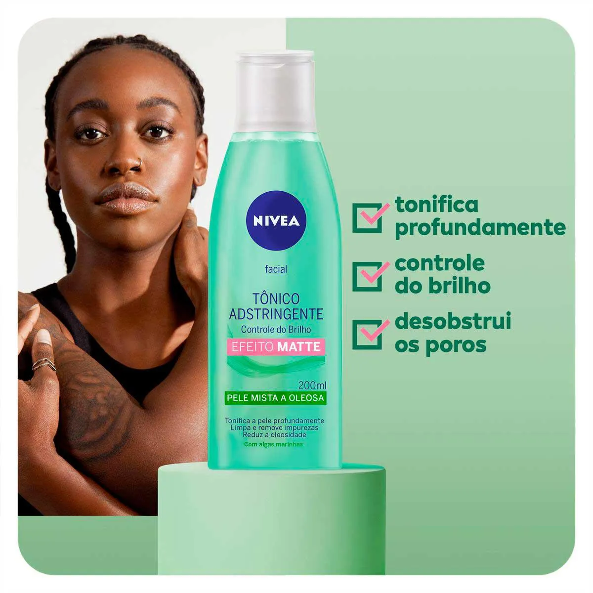 O Tônico Adstringente Nivea é uma solução de uso facial desenvolvido para pessoas que possuem pele mista a oleosa. Sua fórmula não possui álcool etílico e é composta, principalmente, por extrato de Algas Marinhas, Panthenol e Vitamina B5.