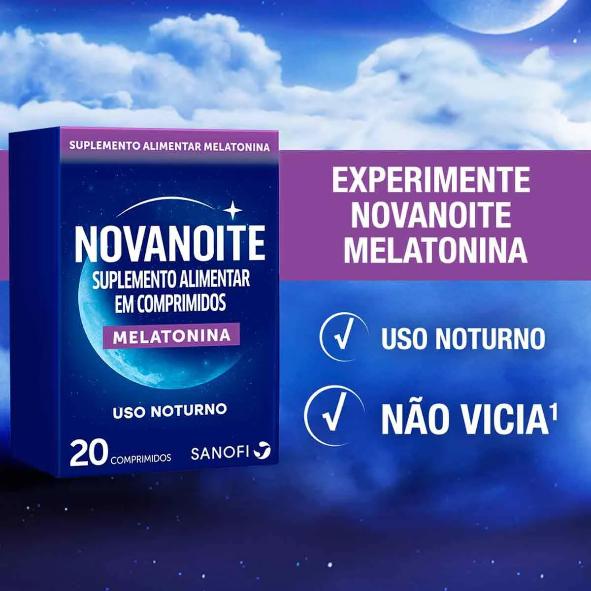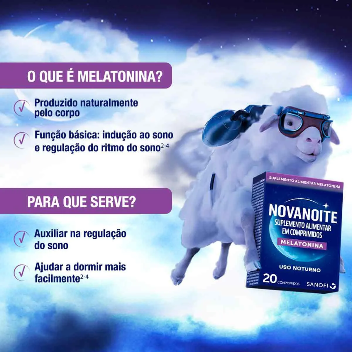 O suplemento Novanoite Melatonina é um suplemento alimentar em comprimidos. A melatonina é uma substância já produzida naturalmente pelo seu Corpo.
