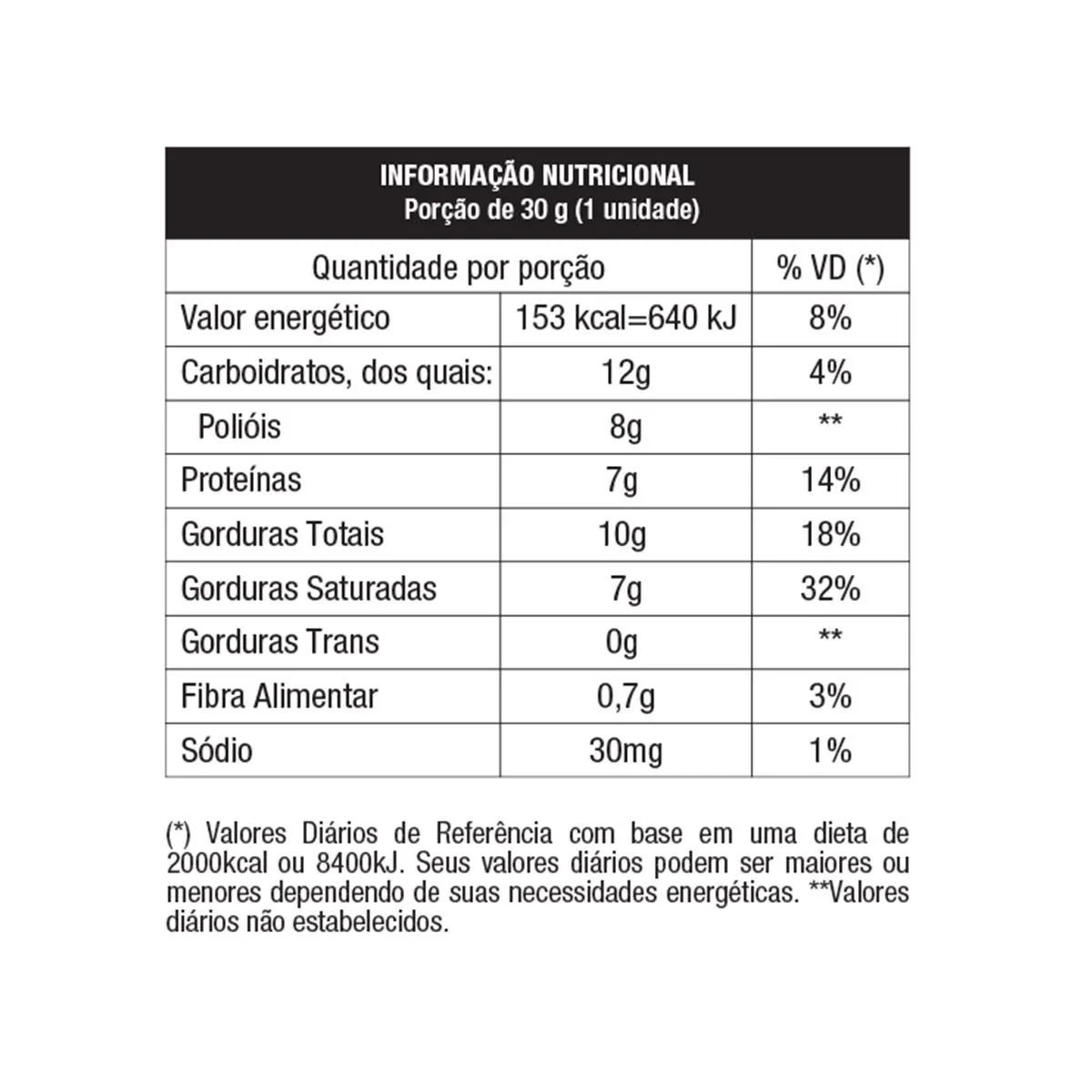 Proteína concentrada do soro de leite, edulcorante maltitol, gordura de palma, gordura vegetal, wafer (farinha de trigo enriquecida com ferro e ácido fólico, gordura vegetal, sal, lecitina de soja e fermento químico bicarbonato de sódio), cacau em pó, aromatizante sintético idêntico ao natural, emulsificantes lecitina de soja e polirricinoleato de poliglicerol e edulcorante sucralose.