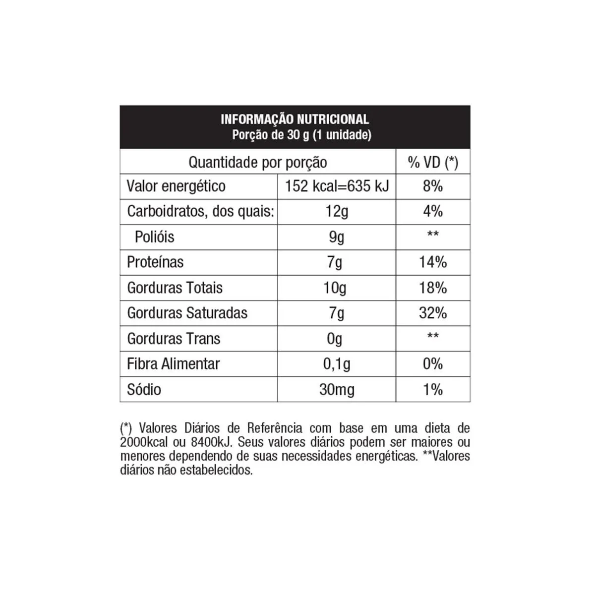 Proteína concentrada do soro de leite, edulcorante maltitol, gordura de palma, gordura vegetal, wafer (farinha de trigo enriquecida com ferro e ácido fólico, gordura vegetal, sal, lecitina de soja e fermento químico bicarbonato de sódio), emulsificantes lecitina de soja e polirricinoleato de poliglicerol, aromatizante sintético idêntico ao natural, corante carmim cochonilha e edulcorante sucralose.