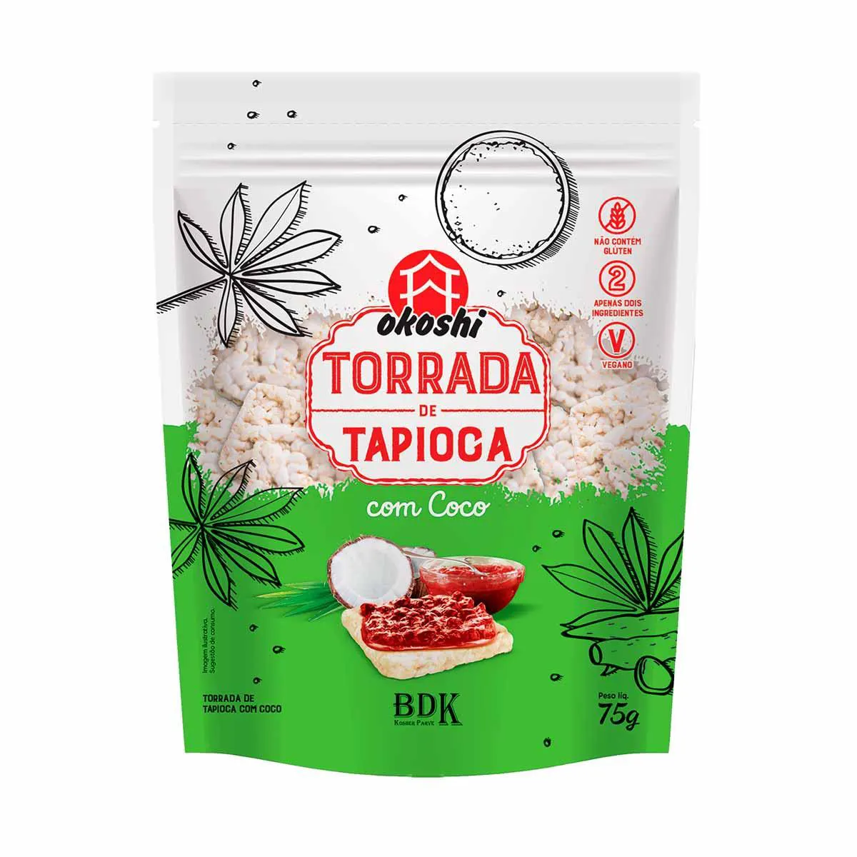 A Torrada de Tapioca com Coco Okoshi 75g contém apenas dois ingredientes: tapioca e coco ralado. Não contém glúten, zero lactose e vegano.