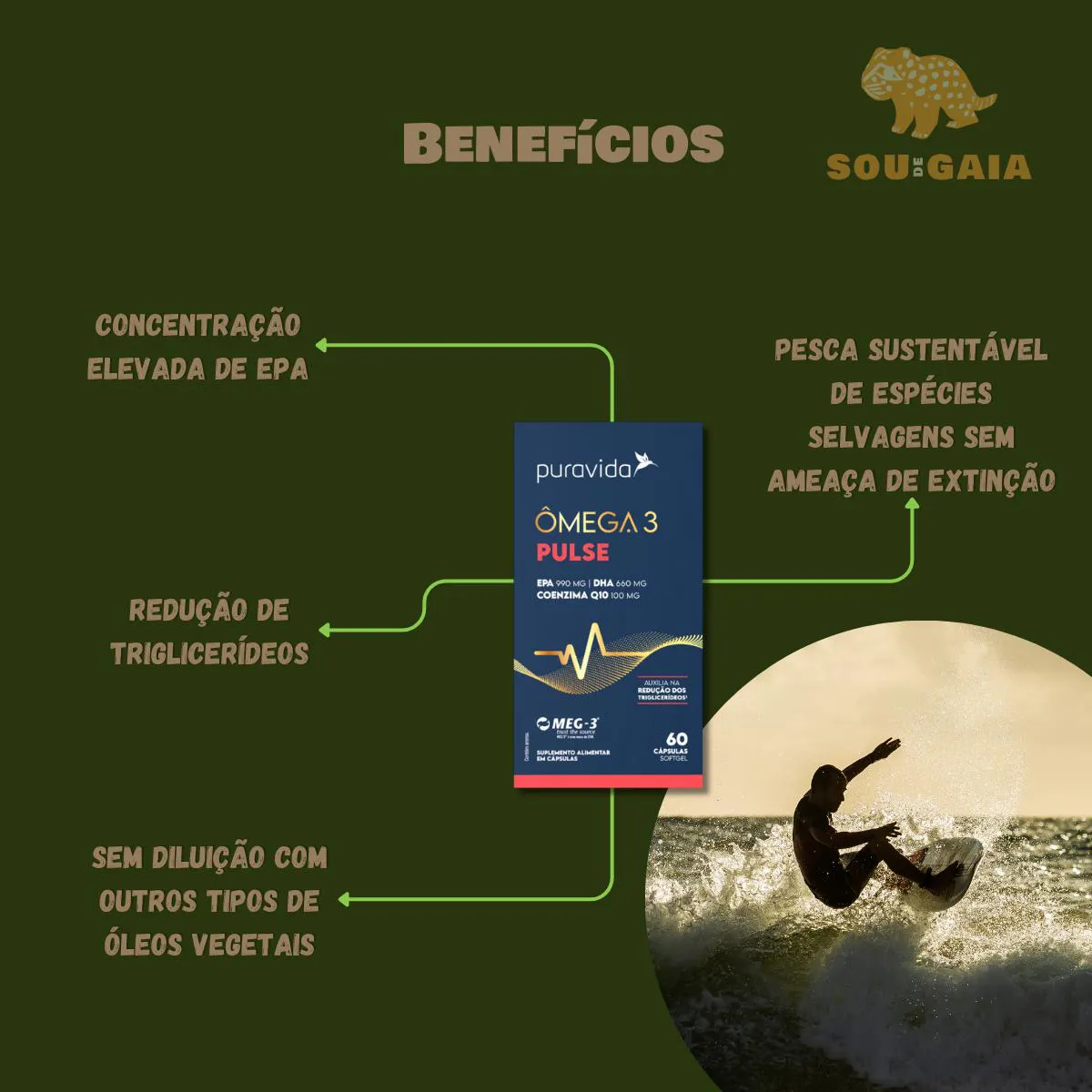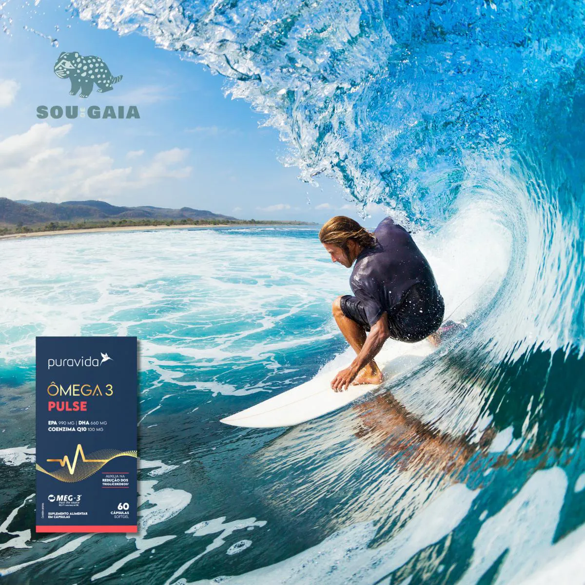 O Ômega 3 Pulse Puravida é elaborado com peixe, contendo elevada concentração de EPA associado a coenzima Q10.