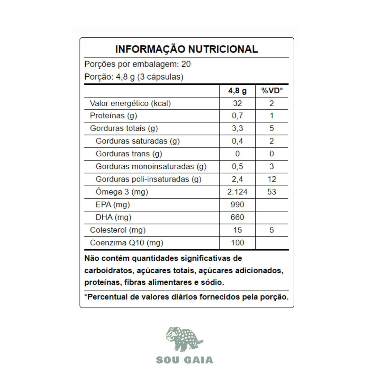 Óleo de peixe,coenzimaQ10, óleo de coco, emulsificane leticina de girassol, aroma natural de limão, estabelizante cera de abelha e antioxidante mistura de tocoferóis. Composição da cápsula: gelatina, água purificada, umectante glicerina e corantes urucum e cúrcuma.