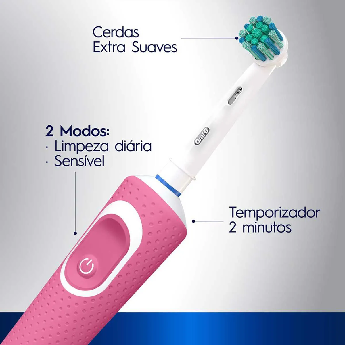 Com 7.600 movimentos por minuto, a escova de dente elétrica Oral B D100 Vitality Kids remove até 100% mais placa do que os modelos convencionais. Ela traz também um sistema de limpeza 2D, que oscila e rotaciona, garantindo sensação de frescor, com dentes mais limpos e lisos.