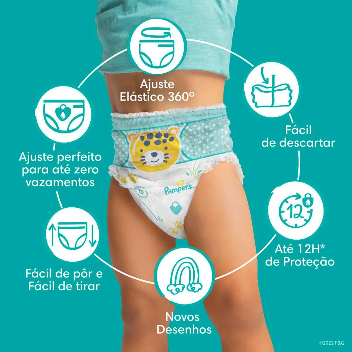 A Pampers Pants Ajuste Total é uma fralda descartável que possui cintura elástica 360º que se adapta ao Corpo do bebê. É fácil de vestir e de tirar, pois funciona como uma calcinha ou cueca, sem aquelas tiras de velcro na lateral.