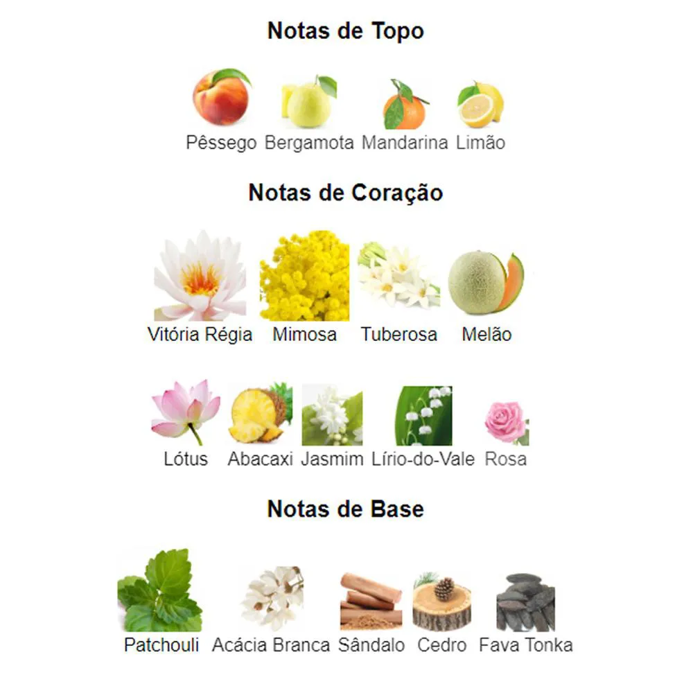 A composição é brilhante nas notas de saída graças às frutas cítricas. No coração reside a frescura da água graças ao nenúfar combinado com notas florais (tuberosa, mimosa, jasmim, rosa e lírio do vale) e frutas doces e suculentas (abacaxi e melão).