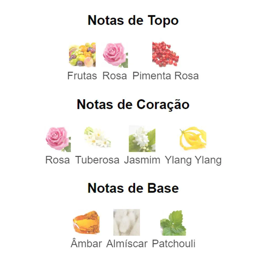 Notas de Coração: Rosa, Tuberosa, Jasmim e Ylang Ylang.