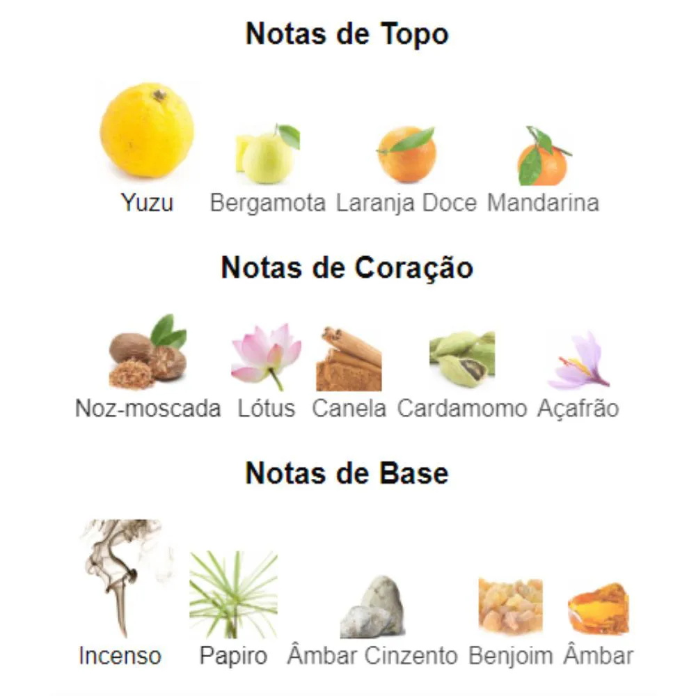 A fragrância abre com uma mistura fresca e vibrante de Bergamota e Yuzu. No coração, um desenvolvimento refinado de Cardamomo, Canela e Noz-moscada. Por fim, as notas de Incenso Negro e Sândalo proporcionam um rastro marcante, duradouro e potente.