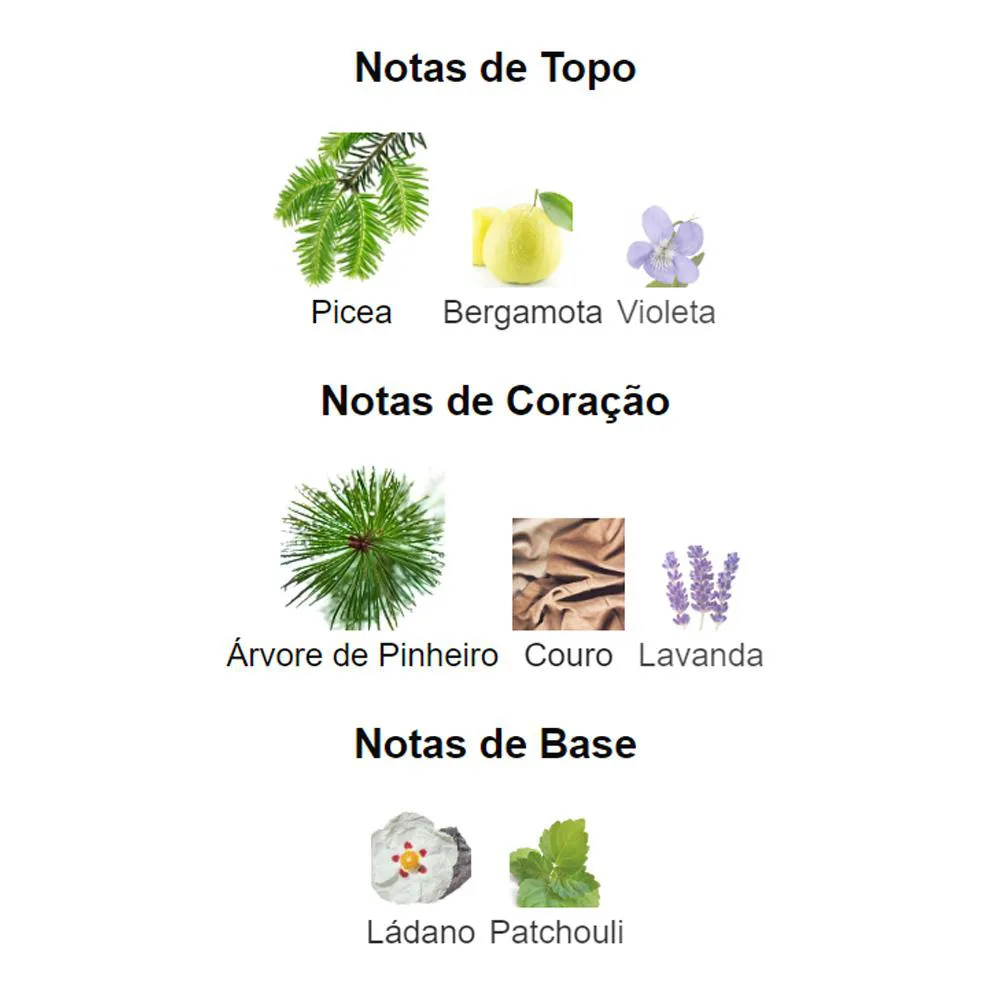 Notas de Coração: Árvore de Pinheiro, Couro e Lavanda.