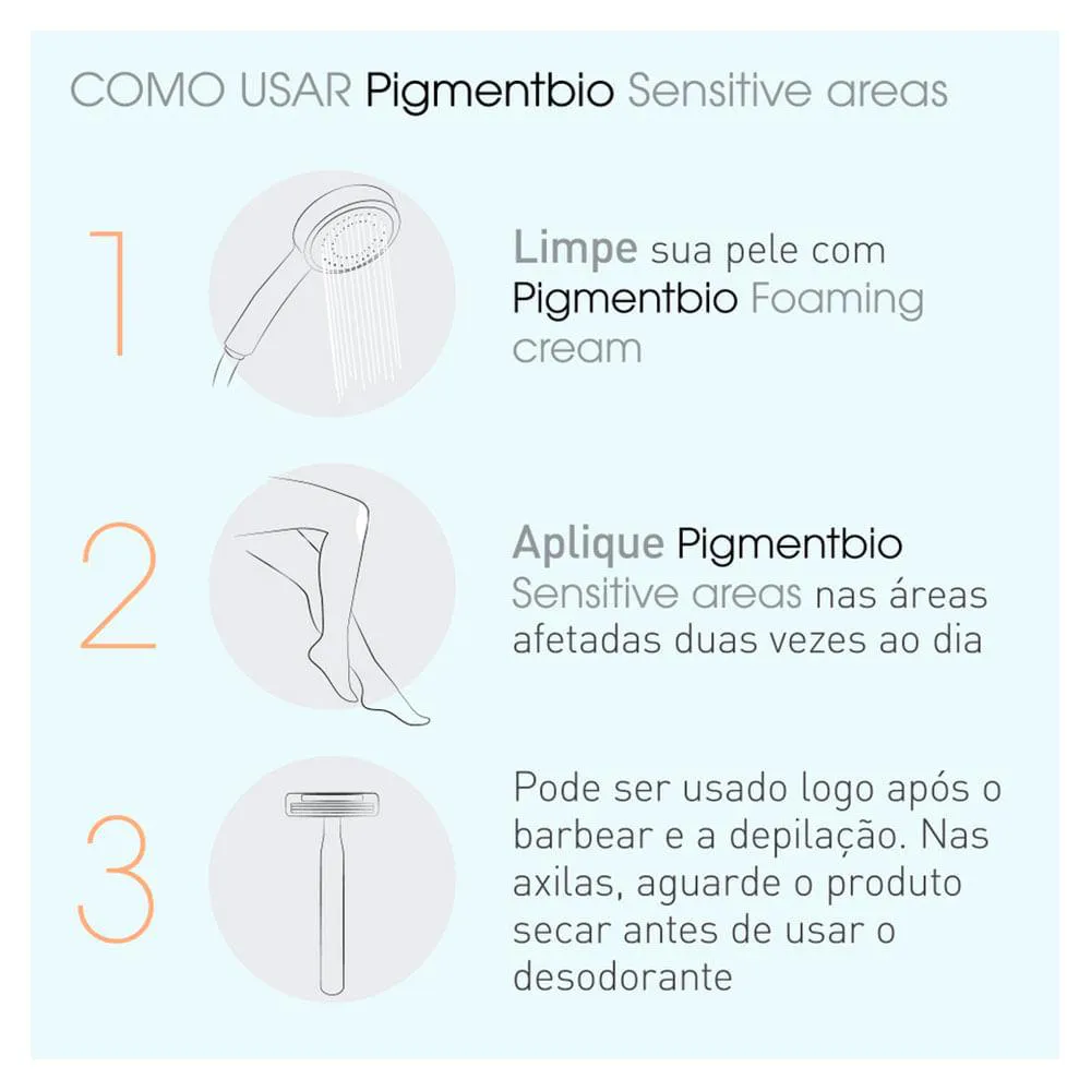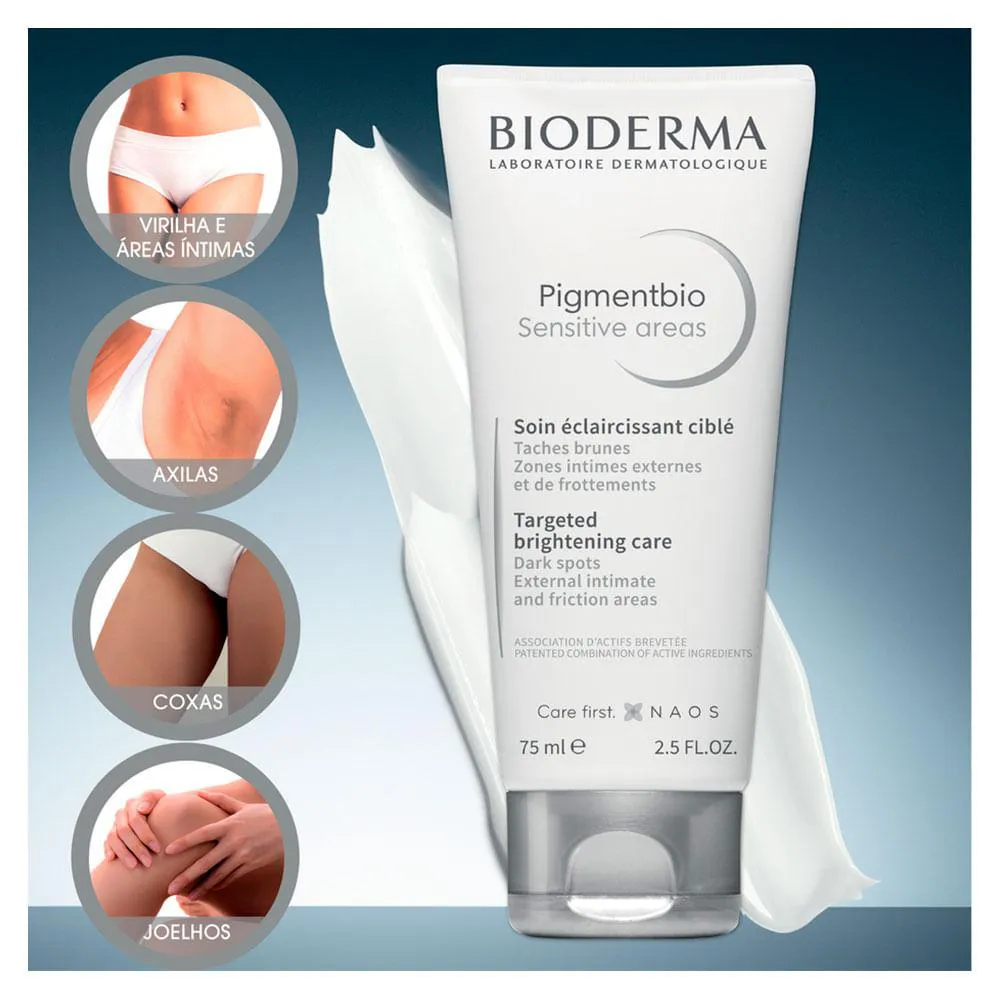 Pigmentbio Sensitive Areas é o primeiro clareador corporal dermatológico especialmente desenvolvido para áreas sensíveis, íntimas (virilha, área perivaginal, perianal), joelhos e axilas.