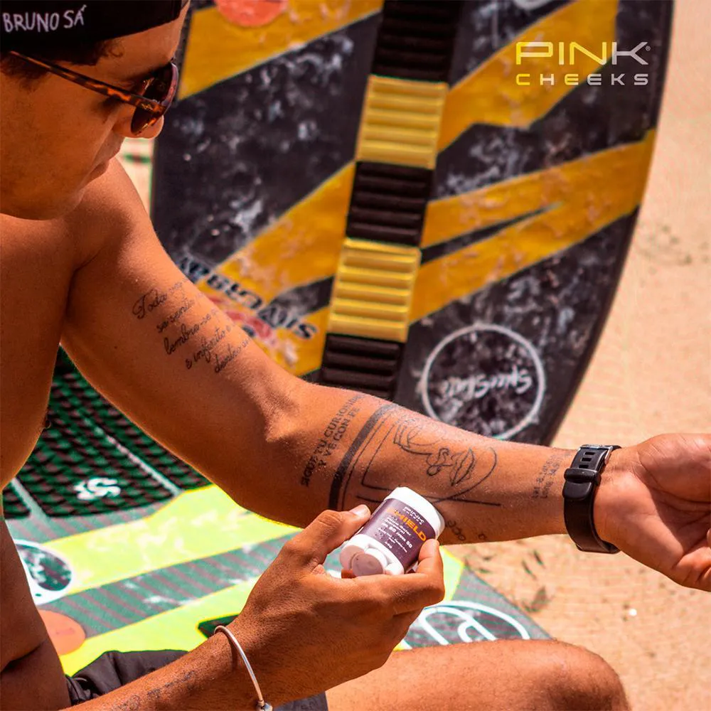 Shield Protetor Solar Corporal bastão FPS60 FPUVA 50 45g Shield é o primeiro protetor solar corporal em bastão, ideal para uso no esporte. Com altíssima proteção FPS60 e FPUVA50 e resistência à água e ao suor por mais de 4 horas. Seu formato em bastão garante maior praticidade na aplicação, deslizando facilmente, sobre a pele. Possui em sua fórmula dois componentes naturais, óxido de zinco e dióxido de titânio, os quais têm como objetivo fazer a reflexão dos raios solares, criando uma camada de proteção, atuando como um escudo sobre a pele contra os danos causados pelo sol, como queimaduras, manchas, prevenindo o envelhecimento precoce e câncer de pele. Devido à altíssima proteção contra os raios UVA e UVB, auxilia na prevenção de marcas de sol nas partes do Corpo que ficam expostas ao sol. Possui toque seco, rápida absorção, não deixando residual oleoso sobre a pele. Indicado para corrida, ciclismo, natação, mergulho e outros esportes que necessitam de alta proteção solar e alta resistência à água e ao suor. Testado dermatologicamente. DADOS TÉCNICOS Protetor Solar corporal em bastão FPS60 FPUVA50 Altíssima proteção Ideal para a prática esportiva Muito resistente à água Toque seco, não oleoso Sem fragrância Vegano e livre de Parabenos Não testado em animais Dermatologicamente testado. * RESULTADO: Proteção Solar * SUGESTÕES DE USO: 1.Aplique o produto diretamente na pele de maneira uniforme; 2.Espalhe com as Mãos até a absorção do produto. Dica: É necessária a reaplicação após a transpiração excessiva ou permanência prolongada na água, para manter a sua efetividade. Se a quantidade aplicada não for adequada, o nível de proteção será significativamente reduzido. * OBSERVAÇÕES: Imagem Meramente Ilustrativa * ITENS INCLUSOS: 1 Pink Cheeks Shield FPS 60 FPUVA 50 Protetor Solar Corporal 45g