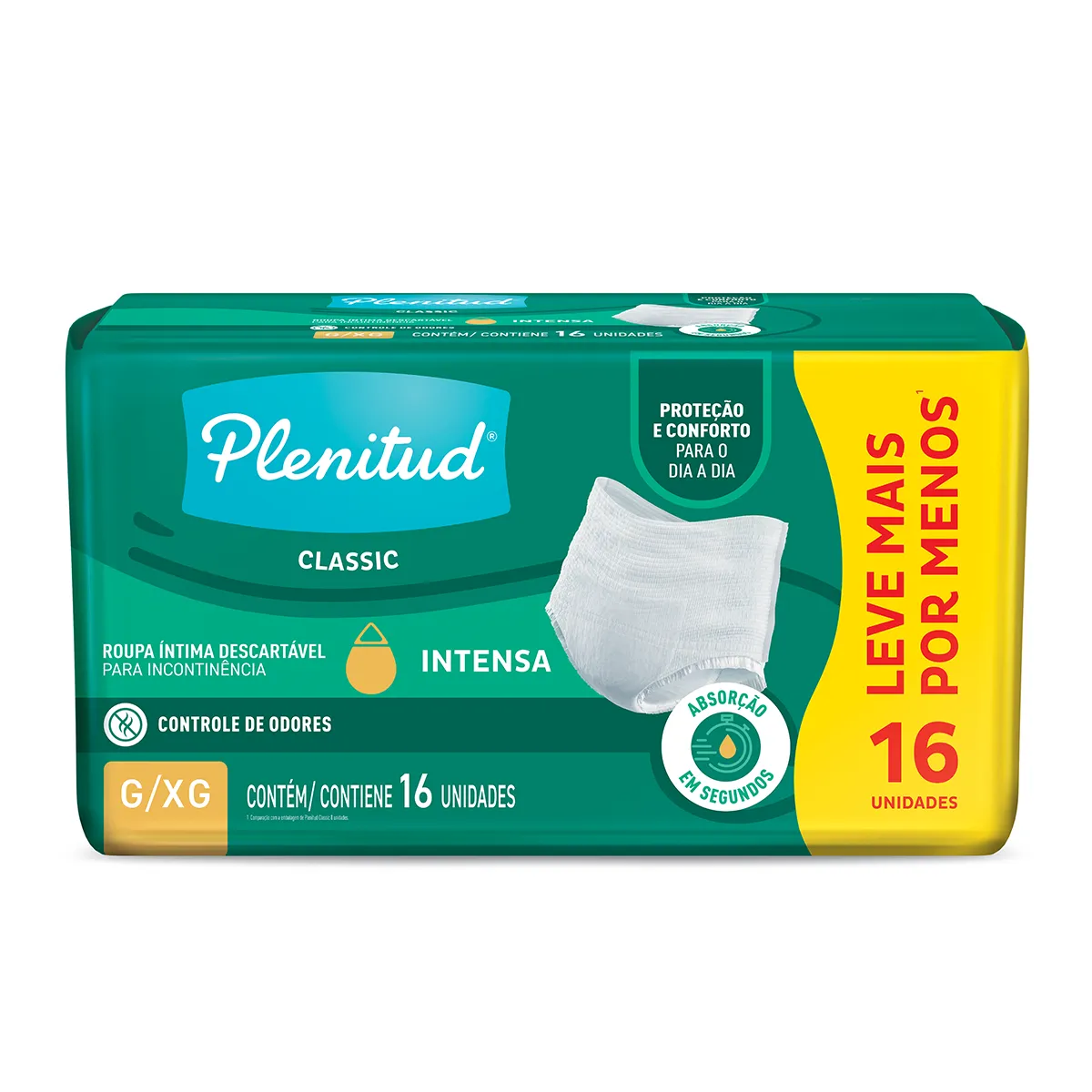 A Plenitud Classic é uma roupa íntima descartável com cintura elástica, fácil de colocar e tirar, que proporciona máxima absorção da urina com controle de odores.