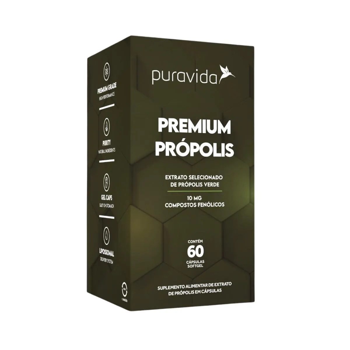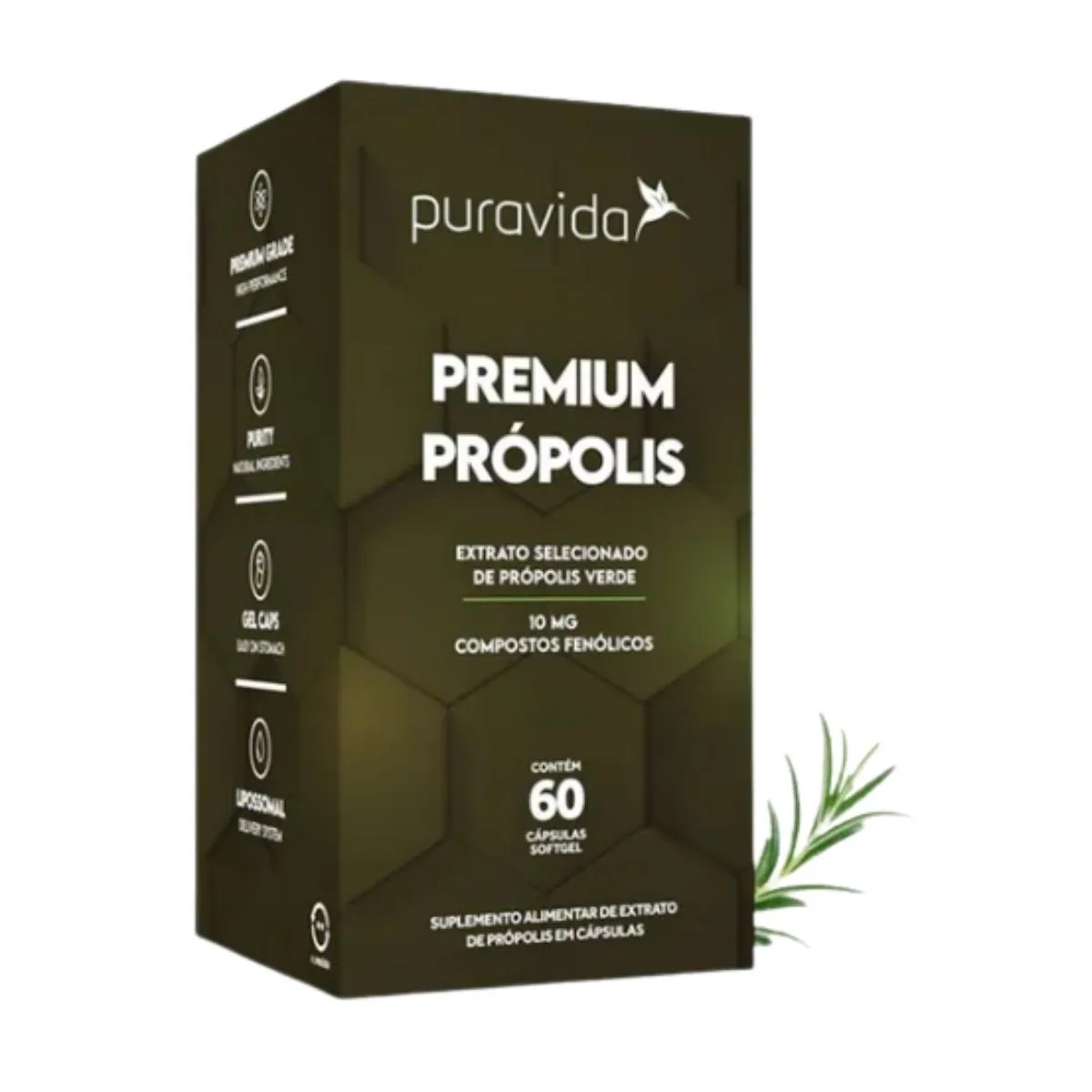 NOSSO EXTRATO DE PRÓPOLIS AGORA TEM 4 VEZES MAIS POLIFENÓIS.   Coletada pelas abelhas na vegetação e utilizada na vedação de todas as frestas da colmeia para protegê-la contra bactérias, vírus e fungos que são capazes de pôr em risco suas vidas, a própolis é uma resina que pode ser obtida em algumas variações, de acordo com as espécies de plantas das quais são coletadas.   A nossa própolis verde é extraída do alecrim-do-campo, espécie vegetal típica do Brasil, muito comum no Estado de Minas Gerais.   Grande parte da produção de própolis verde é exportada para diversos locais do mundo, principalmente para o Japão, onde é muito consumida e estudada. A própolis verde é considerada especial pelos japoneses.   É por isso que trazemos esta inovação, disponibilizando a Própolis Verde em cápsulas no mercado brasileiro, com 4 vezes mais polifenóis.   Isto porque, mesmo com todas suas qualidades, o extrato alcoólico ou aquoso convencional apresenta um inconveniente – seu sabor extremamente forte e acentuado. Muita gente sofre para tomar a própolis devido ao seu sabor intenso e ardido.   CADA DUAS CÁPSULAS CORRESPONDEM A 36 GOTAS DA PRÓPOLIS LÍQUIDA   A Puravida uniu a praticidade e a precisão da dosagem dos princípios ativos concentrados. Desenvolvemos em formato de cápsula um concentrado puro, natural e premium desta dádiva brasileira.   EXTRATO DE PRÓPOLIS VERDE SEM O SABOR DESAGRADÁVEL. Colhida pelas abelhas em matas silvestres,longe de qualquer centro urbano ou industrial, pura e rica, sem qualquer traço de contaminantes, a Própolis Premium possui a potência que você precisa.