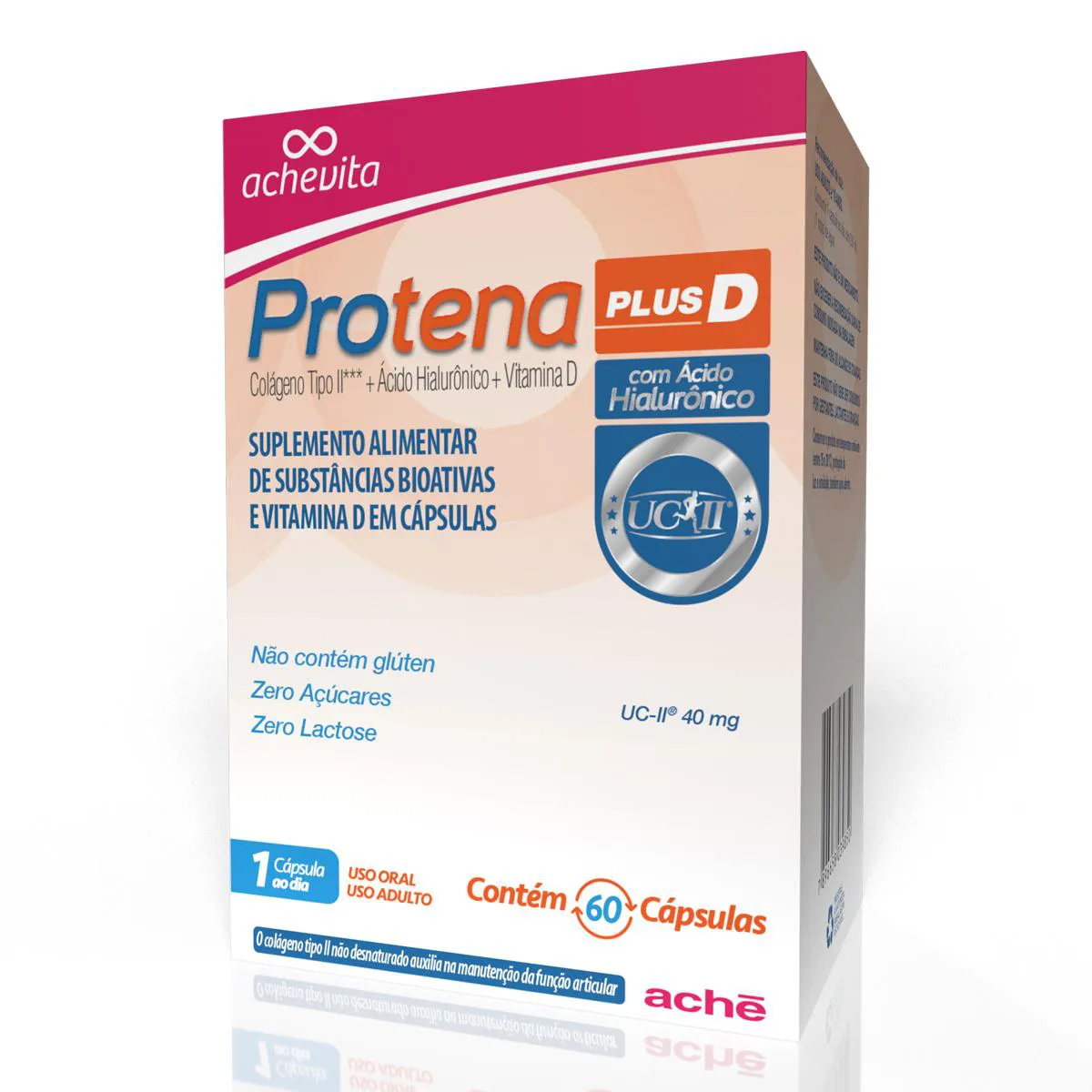 O Protena Plus D é um suplemento alimentar em cápsulas formulado com UCII 40mg (Colágeno Tipo II), Ácido Hialurônico e Vitamina D 1.000UI.