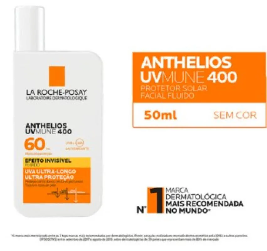 O Novo Protetor Solar La Roche-Posay Anthelios UV Mune 400 traz uma completa revolução em filtros UV com a nova tecnologia Mexoryl 400. O Melhor filtro solar contra os raios UV mais danosos*. Além disso, o Anthelios UV Mune 400 possui uma formula completa com: Ultra Proteção FPS 60 (SPF50+), Ultra Resistência a água, suor e areia e Ultra Invisível em uma textura fluida para todos os tipos de peles.