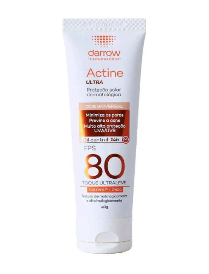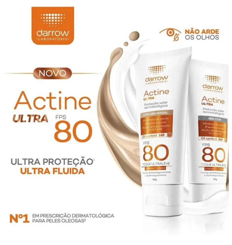 Protetor solar facial para peles oleosas e acneicas. Darrow Actine Ultra Proteção FPS 80 tem fotoproteção UVA/UVB e ação antioleosidade por até 14 horas, com textura ultrafluida de absorção imediata e toque ultraleve.