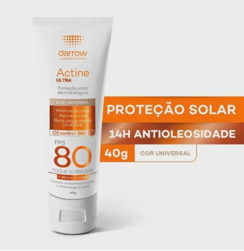O Protetor Solar Facial Darrow Actine Ultra Proteção FPS 80 apresenta fórmula especialmente desenvolvida para a pele brasileira, com complexo exclusivo de ativos que garante tripla ação antioleosidade: controlando a oleosidade, prevenindo a acne e reduzindo os poros. Hipoalergênico, não comedogênico, testado dermatologicamente e oftamologicamente. Produto não testado em animais.